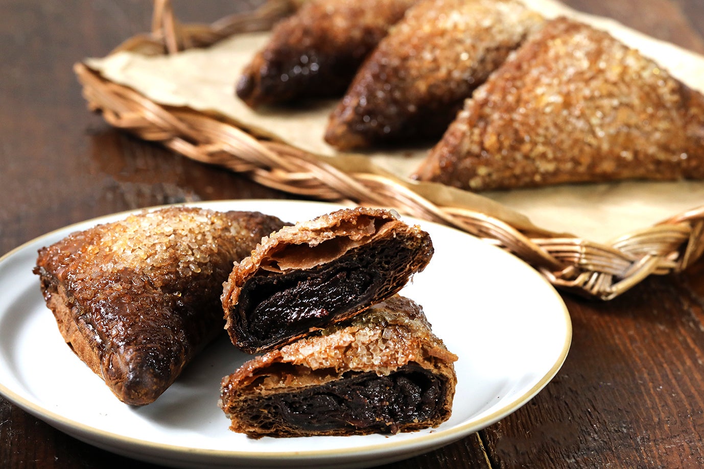 チョコをパイ生地で包み、仕上げにザラメをまぶして焼き上げました。そのままでもサクサクなパイ生地の食感やチョコの味わいをお楽しみいただけますが、オーブンで5分ほど温めていただくと、中身のチョコがとろりととろけ出してより濃厚なチョコ感をお楽しみいただけます。ティータイムなどに、コーヒーやカフェラテと一緒にご賞味ください。