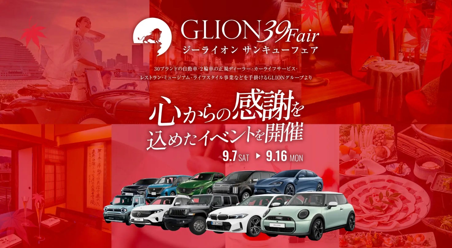 GLIONグループ(ジーライオングループ 所在地:兵庫県神戸市)は、2024年9月7日(土)から9月16日(祝・月)までの10日間、日頃からご愛顧いただいているお客様に感謝の気持ちを込めて開催するビッグイベント「GLION 39 Fair」https://39fair.glion.co.jp/を開催しております。車のプロがオススメする人気のイチオシ車両や期間中にご成約いただいた方限定のダブルチャンス企画、その他GLIONグループ各拠点にて大変お得なプランを販売しております。ぜひこの機会にGLIONグループ各店舗へお越しください。