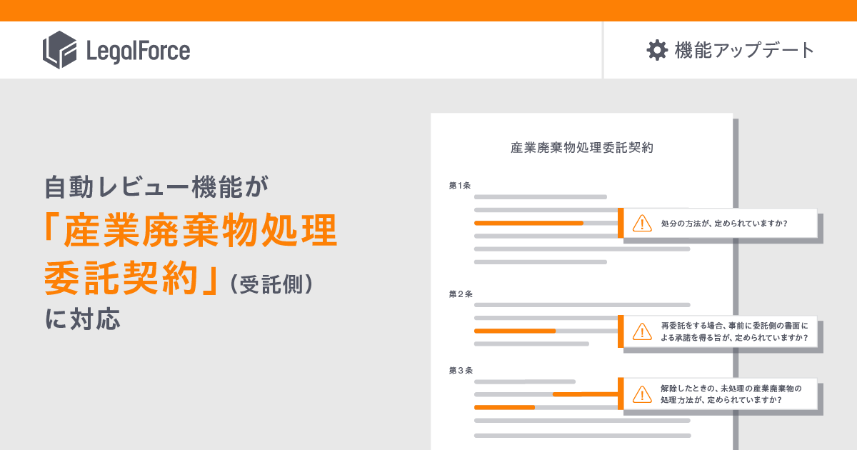 AI契約審査プラットフォーム「LegalForce」、自動レビュー機能が「産業廃棄物処理委託契約」(受託側)に対応開始