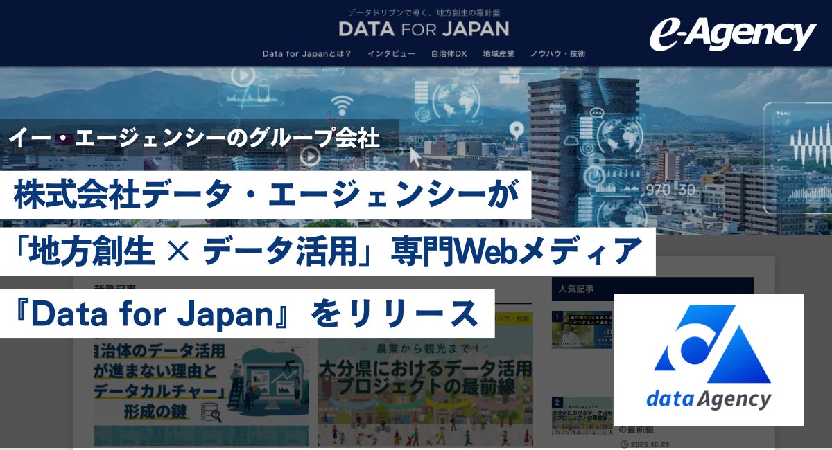 “おもてなしを科学する”株式会社イー・エージェンシー(本社:東京都千代田区、代表取締役:甲斐真樹、以下イー・エージェンシー)は、グループ会社である株式会社データ・エージェンシー(本社:東京都品川区、代表取締役:藪本 秀之、以下データ・エージェンシー)が、2025年10月29日に「地方創生×データ活用」専門Webメディア『Data for Japan』を公開したことをお知らせいたします。