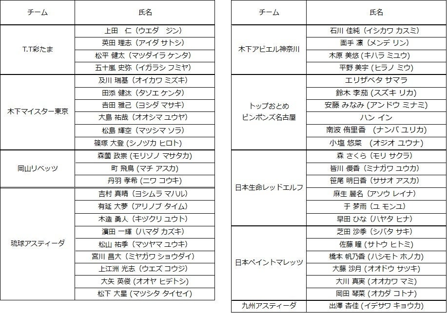 卓球のTリーグ 2022-2023シーズン 登録完了選手(2022年5月8日付)