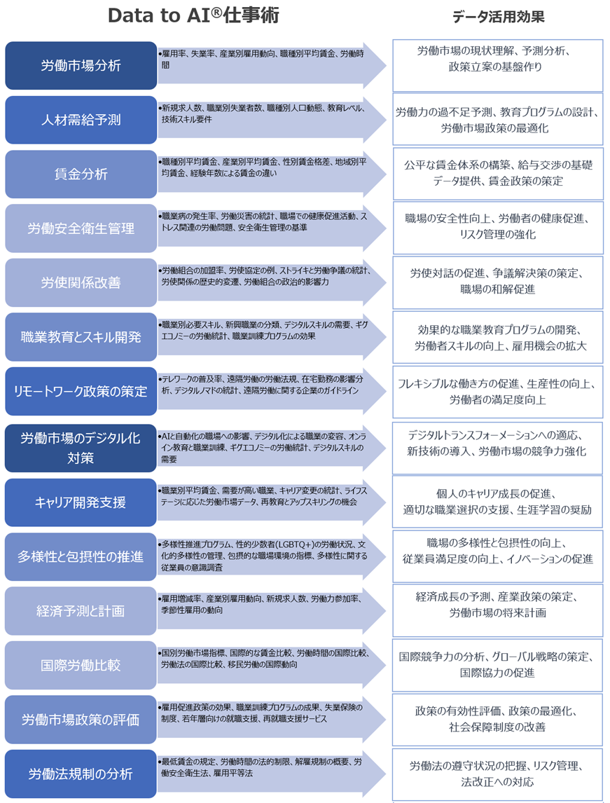 - 効果: 労働市場の現状理解、予測分析、政策立案の基盤作り