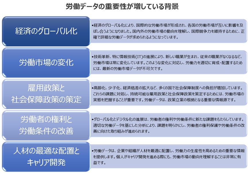 これらの背景により、労働データの収集、分析、共有の重要性が高まっています。正確でタイムリーなデータは、政策立案者、企業経営者、労働者、求職者など、多くのステークホルダーにとって貴重な資源となっています。