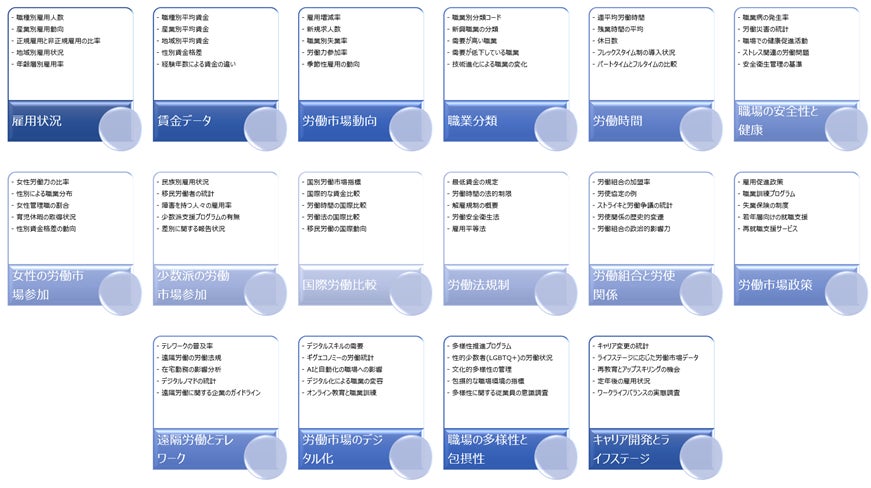 労働市場の理解を深めるためには、幅広い視点からのデータ収集が必要です。現代社会では、経済のグローバル化、技術革新、人口動態の変化など、多くの要因が労働市場に影響を与えています。これらの変化を踏まえ、労働に関するオープンデータは、政策立案者、研究者、企業、労働者個々人にとって、より戦略的な意思決定を行うための貴重な資源となっています。労働のオープンデータは、労働市場の動向を把握し、政策立案や研究、個人のキャリア開発に役立つ多様な情報を提供します。以下は、具体的な分野とそれに関連するデータの例です。