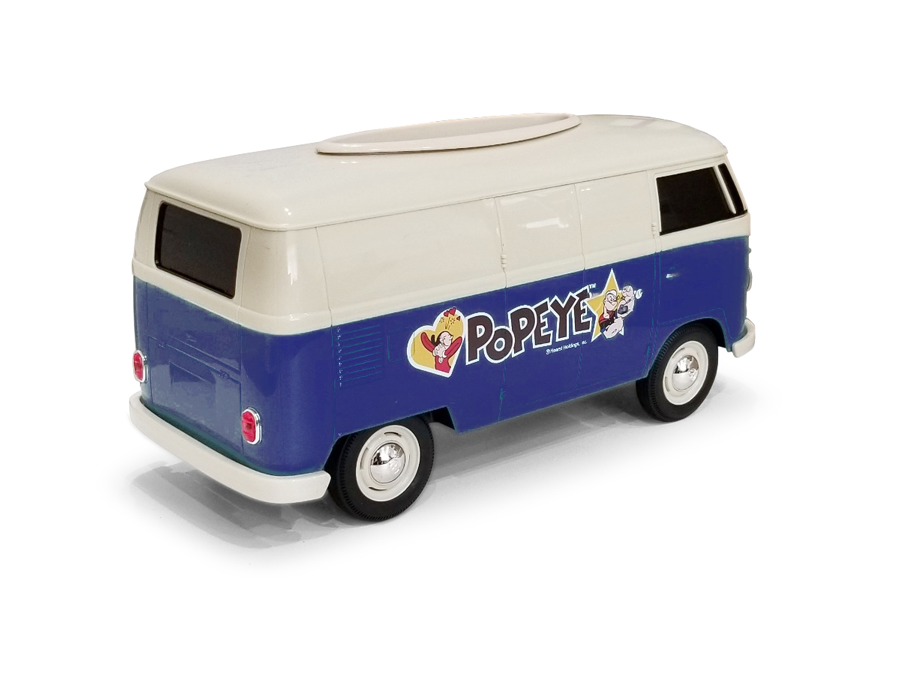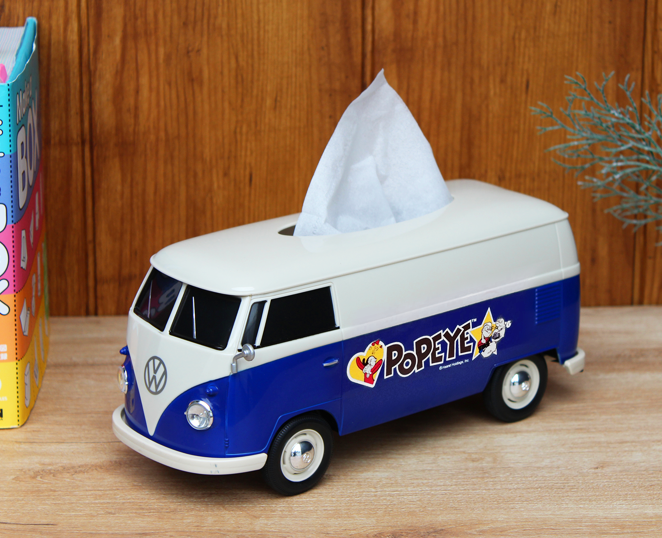 レトロなネイビーの車体にポパイがプリントされたVolkswagenのバス型ティッシュケース。