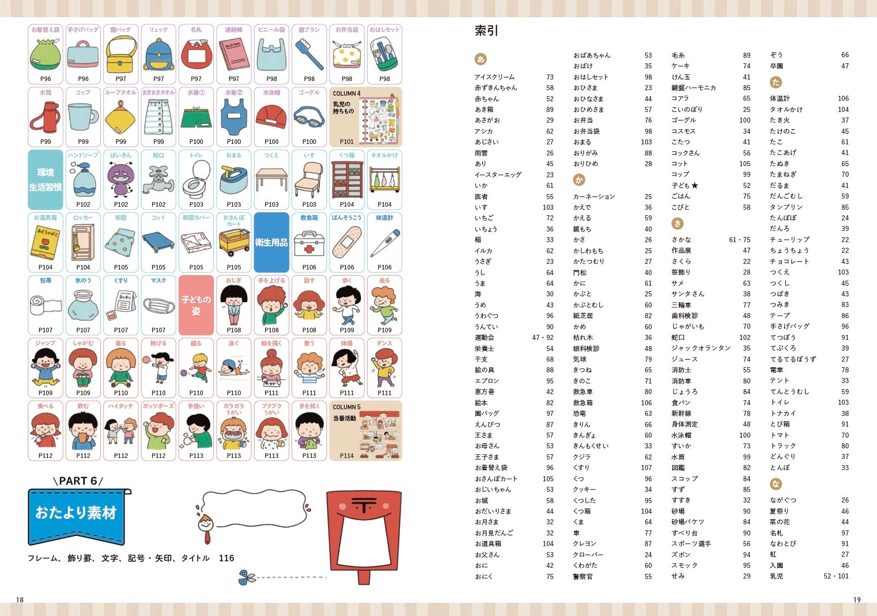 元保育士のジャブノオウチさんの経験をもとに、おたよりなどに使えるかわいいフォントや飾り枠、飾り罫のアイデアもたくさん掲載しています。季節感のあるイベントや、いきもの・たべもの・のりもの、園生活に欠かせない持ちものや遊び、生活習慣にかかわるものなど、描きたいモチーフや、子どもたちに描いてあげたいイラストが見つかるはず