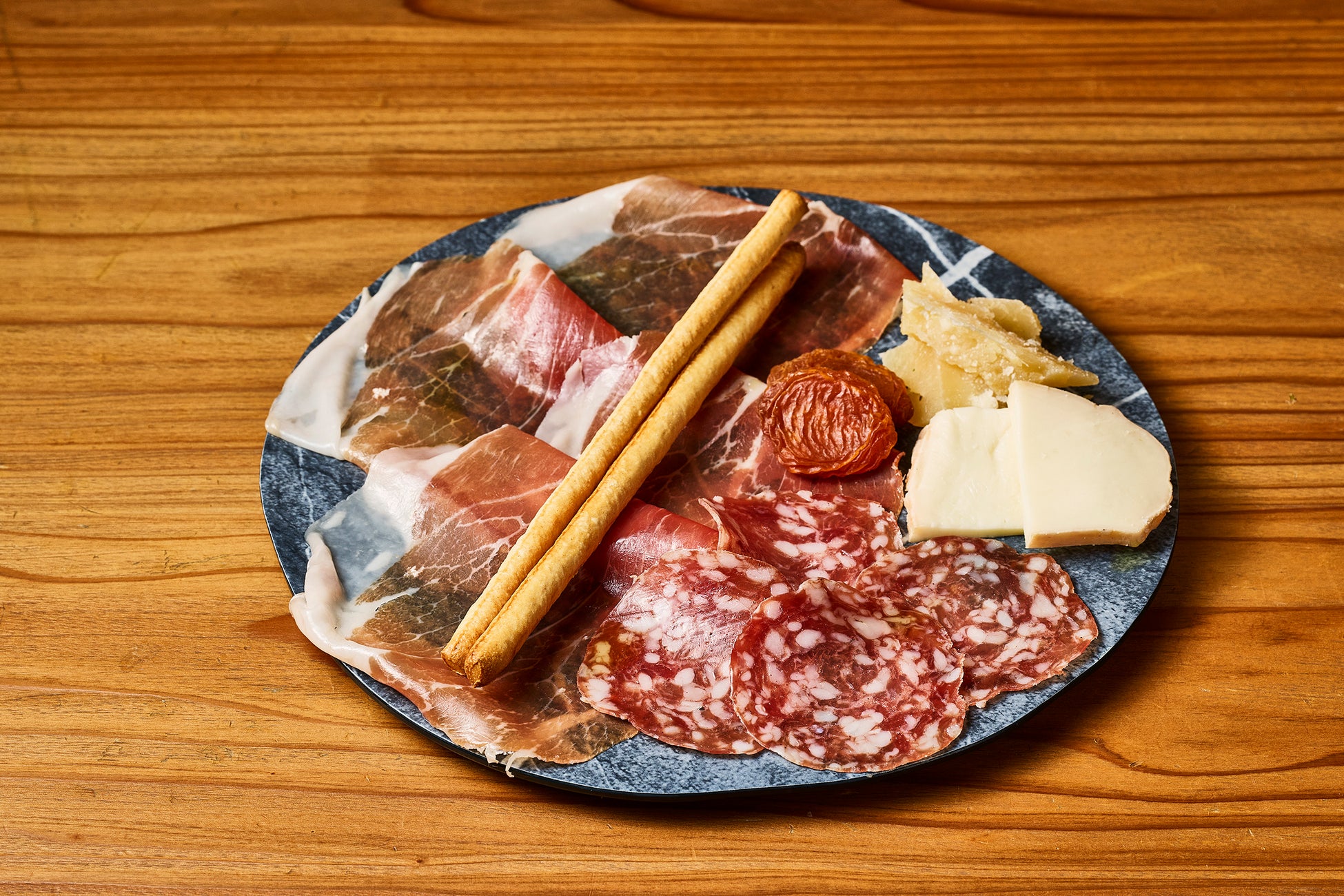 ハモンセラーノ、イタリアンサラミ、24ヶ月熟成のパルメザンチーズ、イタリア産のウォッシュチーズのタレッジョを盛り合わせました。