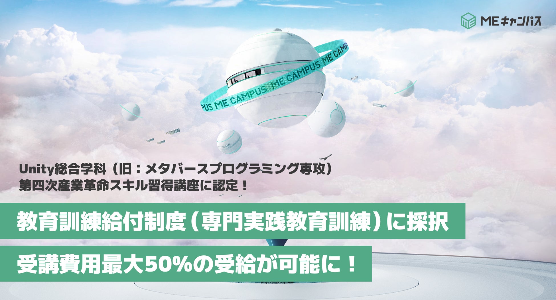 この度、MEキャンパスで開講している『Unity総合学科(旧:メタバースプログラミング専攻)』が、経済産業省の第四次産業革命スキル習得講座認定および厚生労働省「教育訓練給付制度(専門実践教育訓練)」対象講座として採択されました。これにより、一定の条件を満たした学生は、本講座の受講費用の最大50%の給付を受けることが可能となります。