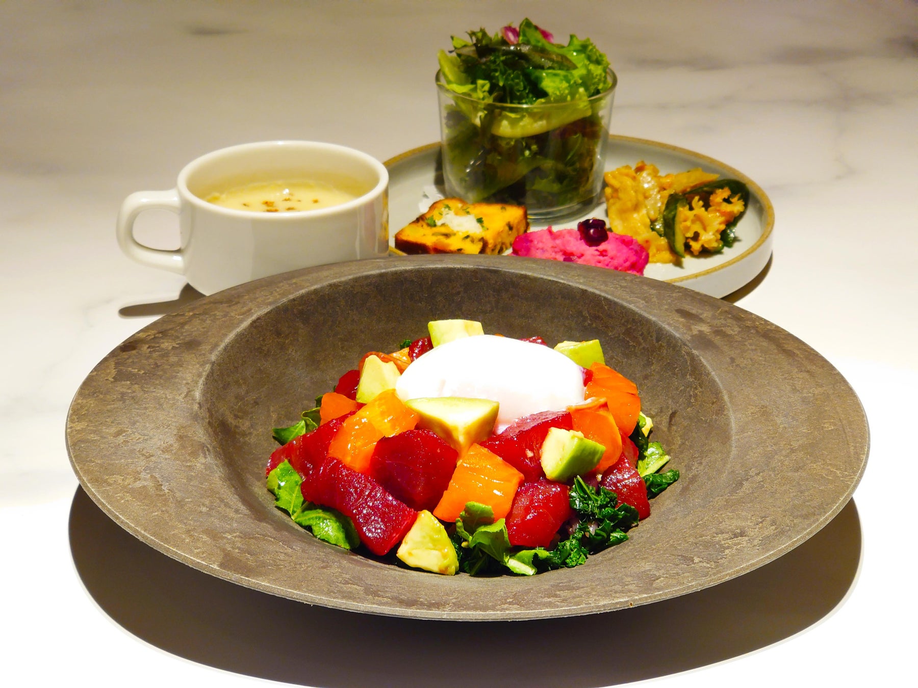ロートレシピのランチセットで提供している季節のデリ3種と、二十四節季(2週間)ごとに具材が変わる薬膳スープです。食事の前にスープで身体を温めることで消化を助けます。