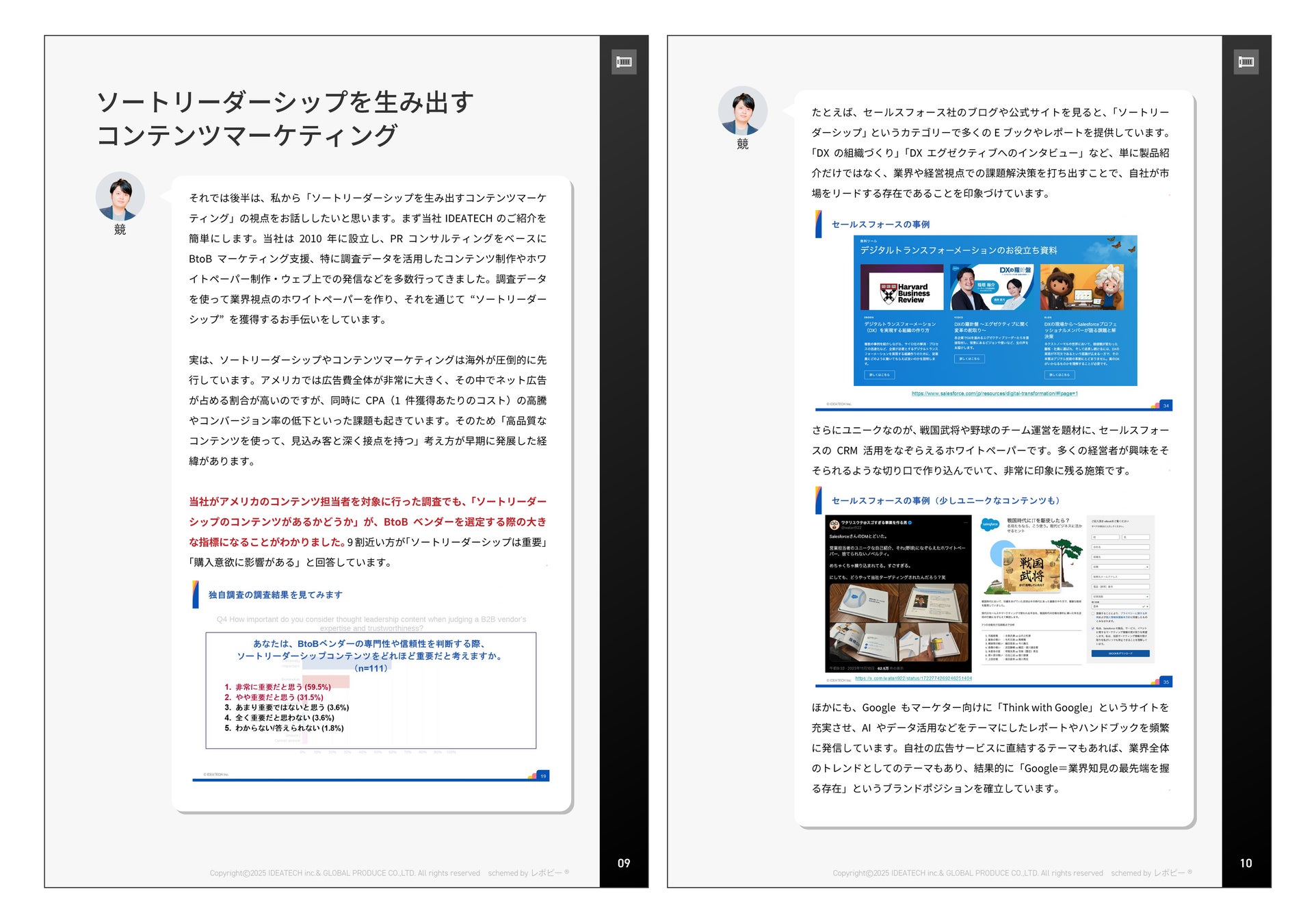 コンテンツPR・コンテンツマーケティング・コンテンツセールスを総合支援する、株式会社IDEATECH(本社:東京都港区、代表取締役社長:石川友夫)は、株式会社グローバルプロデュース(本社:東京都渋谷区、代表取締役社長:光畑 真樹)と共同で、2024年1月30日(木)12:00-13:00に「セールスフォース、GAFAMの事例で探る「業界No.1」を作り上げたマーケティング・ブランディング方法を解説〜イベントとコンテンツの二軸から見るトップ企業の手法とは〜」と題するオンラインセミナーは、BtoBマーケティングにおけるソートリーダーシップ戦略や、リアルイベントとコンテンツマーケティングの掛け合わせによる具体的な手法が紹介され、参加者の新たな視点を生み出す有意義なイベントとなりました。