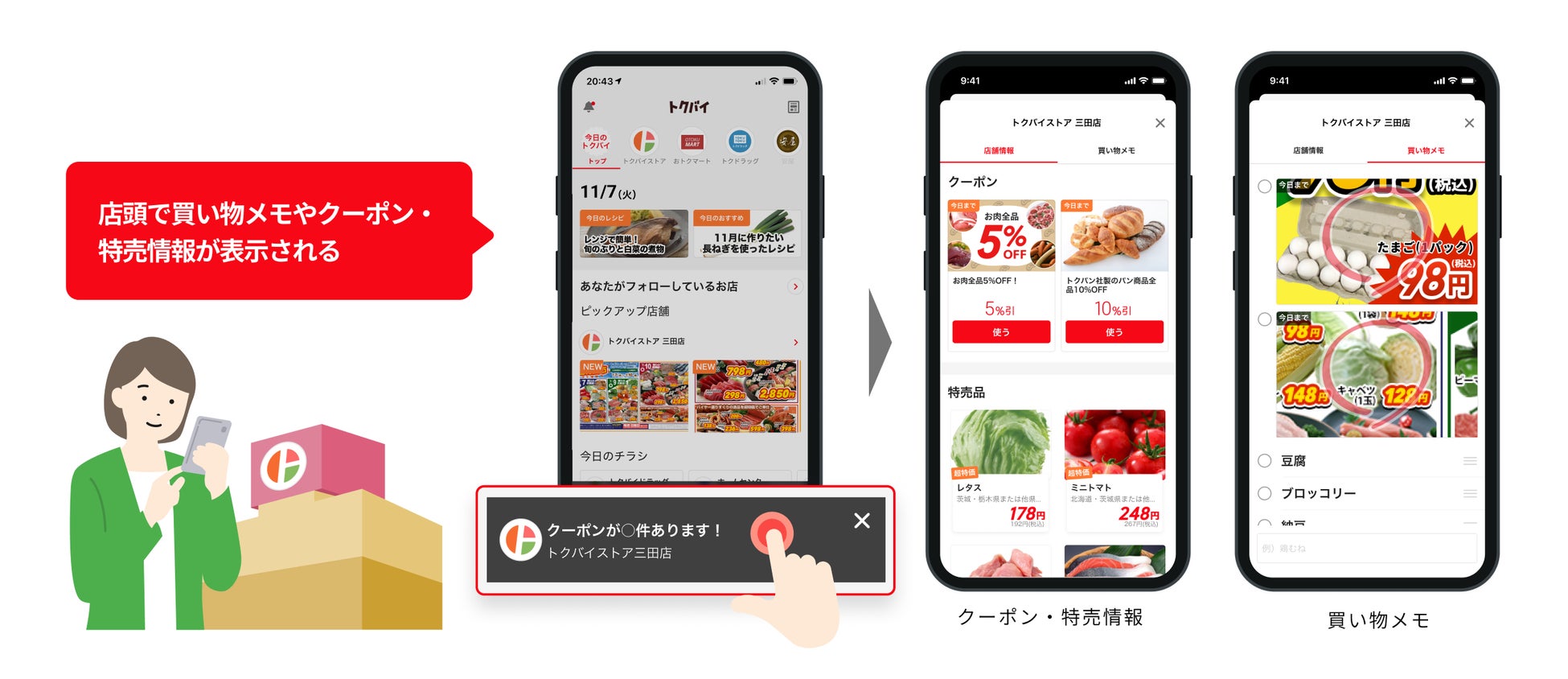 「買い物メモ」でチラシを保存した店舗を訪れた際、店頭でアプリを開くと、買い物メモやクーポン・特売情報が一覧になった「店頭スマートチェック」ページを掲出。その店舗で利用可能なクーポンや特売情報を表示します。ユーザーは「買い物メモ」で買い忘れを防ぐのはもちろん、その店舗のお得な情報を逃さずひと目でチェックできます。