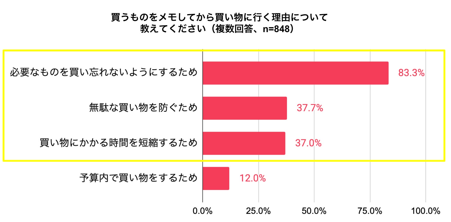 事前に買い物メモを作成する人の割合は全体の8割以上、作成する主な理由は、「必要なものを買い忘れないようにするため」「無駄な買い物を防ぐため」「買い物にかかる時間を短縮するため」