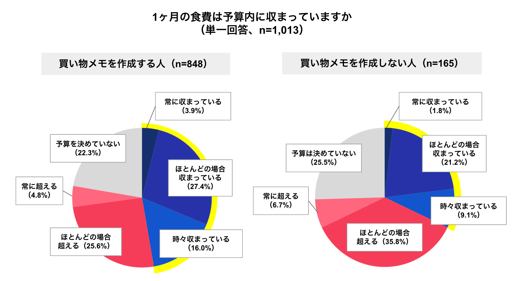 事前に買い物メモを作成する人は食費が予算内に収まる割合が、作成しない人に比べて15ポイント上回る