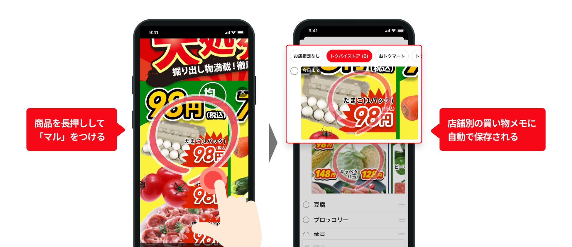 2.「買い物メモ」でチラシを保存し店頭でトクバイアプリを開くと、保存したメモやクーポン・特売情報を一覧で表示
