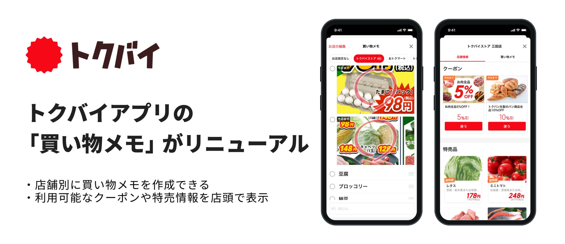 〜トクバイアプリの「買い物メモ」がリニューアル!店舗別の買い物メモや店頭でチェックしやすいクーポン・特売情報一覧機能も搭載〜