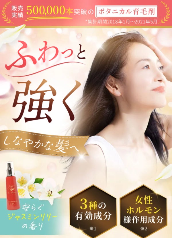 女性の抜け毛の原因の一つに急激な女性ホルモンの変動が関係し、ヘアモアには女性ホルモン様作用成分※が配合されており、育毛促進、毛生促進、病後・産後の脱毛予防、育毛、養毛、ふけ・かゆみの予防、薄毛・脱毛の予防に効果が認められた医薬部外品です。