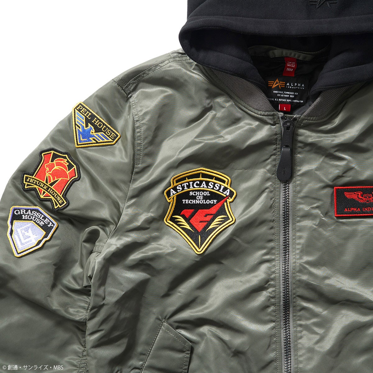 フード部にはALPHAのワンポイント刺繍、脇にはスクールロゴをプリントで配置。袖のリボンもALPHA社のリボンとアスティカシア高等専門学園のロゴが入った2種が付く特別仕様となっています。信頼のALPHA社製で、ガンダムの世界観溢れる、1ランク上のミリタリーファッションをお楽しみください。