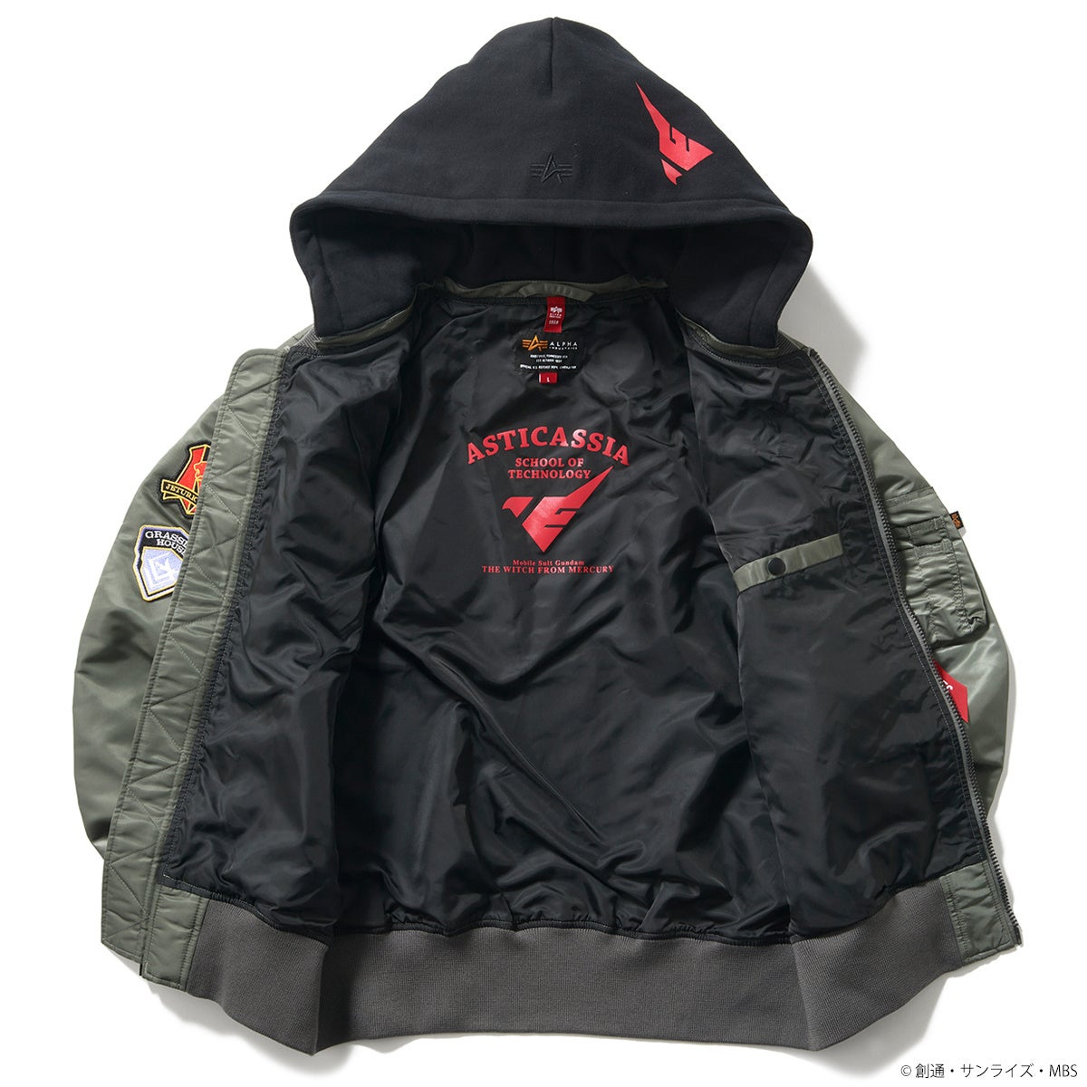 『機動戦士ガンダム 水星の魔女』に登場するアスティカシア高等専門学園の制服をイメージしたV.グレー(ビンテージグレー)のベースカラーに、ブラックのカットソー素材のフードが付いたモデル。右胸にはアスティカシア高等専門学園のスクールロゴをアレンジしたワッペンを配置。左胸のALPHAのロゴワッペンは取り外し可能で、下からは「ASTICASSIA」の文字が出る仕様となっています。右袖にはペイル寮、ジェターク寮、グラスレー寮、各寮のロゴをモチーフとしたワッペンを配置しました。裏面にもスクールロゴをモチーフとしたプリントを施しています。