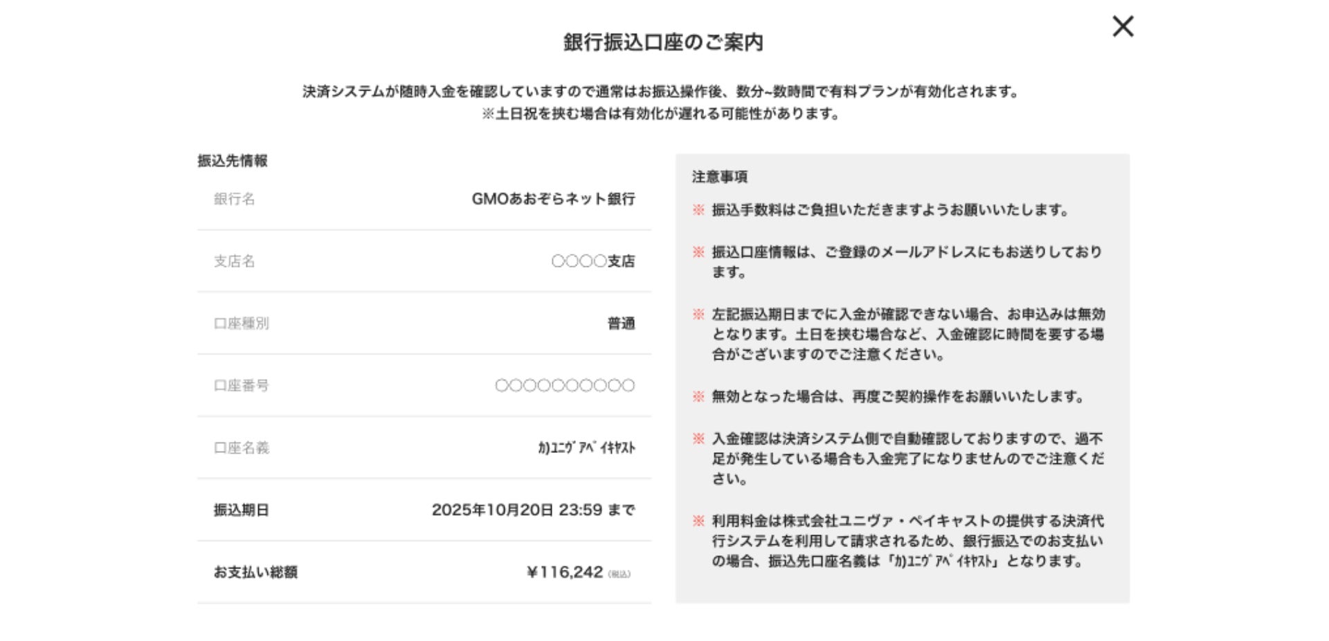 本アップデートでは、有料プランの利用料金を銀行振込でお支払いいただく際の振込先口座の有効期限が、従来の7日間以内から30日以内へ延長されます。これにより、事業者が余裕をもった支払いスケジュールで有料プランを利用開始できるようになり、契約手続きの利便性が向上します。