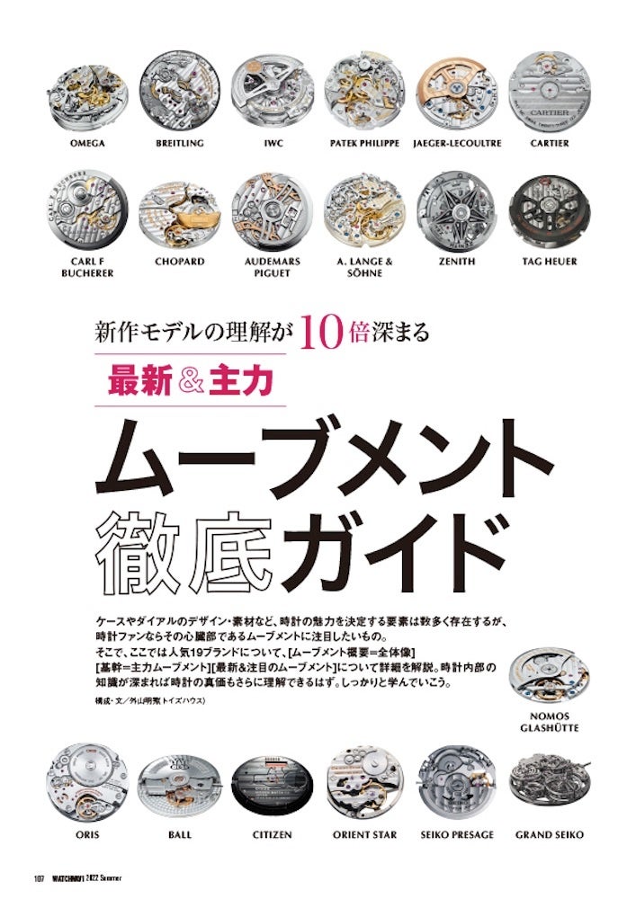 「最新&主力ムーブメントガイド」では、自社でムーブメントを製造できる体制を持つ19ブランドの代表的なキャリバーの特徴を解説。巻頭特集と合わせて読めば、腕時計の理解が深まること間違いなし!
