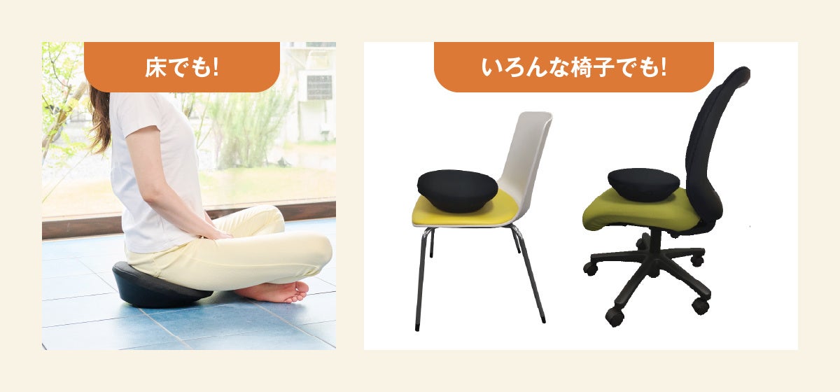 空気で膨らませる一般的なバランスボールに比べて省スペースで、ダイニングチェアやオフィスチェアなど椅子を選ばずどんな座面にも置いて使用できます。座って骨盤を動かすことで、仕事中やTVを見ながらでも簡単にストレッチができ、「ながら運動」の習慣作りも期待できます。