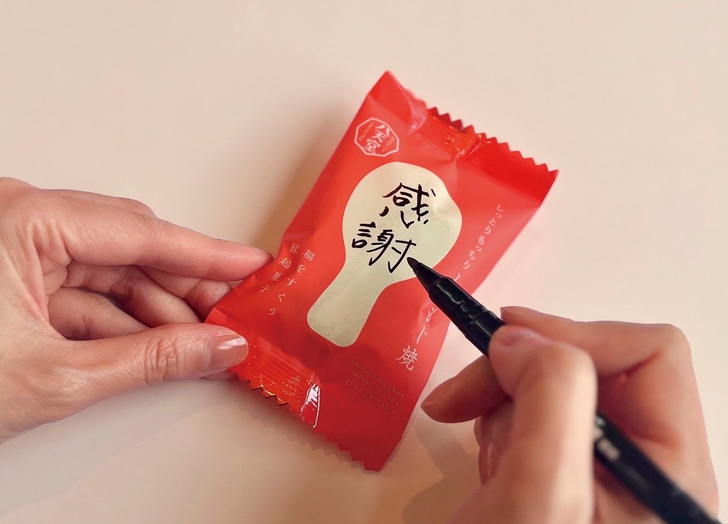 上包みはハレの日をイメージした鮮やかな朱色を基調に採用し、また個包装のしゃもじ形の部分には想い想いのメッセージを記入しお渡しいただくことも想定したデザインに仕上げました。