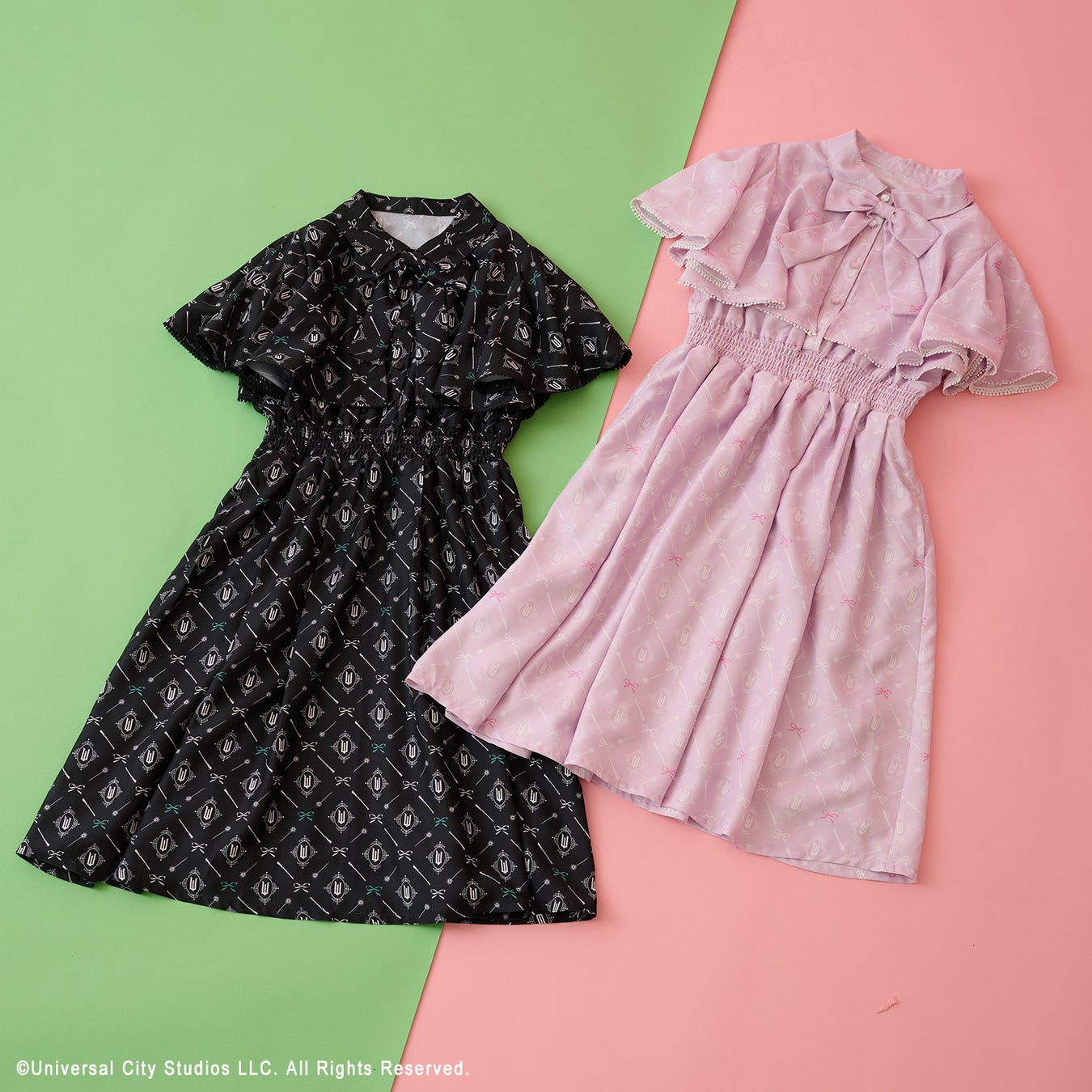 物語のキャラクターをイメージしたカラーが映える、『ウィキッド』オリジナル柄の特別なワンピース。 軽やかなブラウス素材にケープを重ね、ふんわりとしたシルエットとリボンタイで上品に仕上げました。