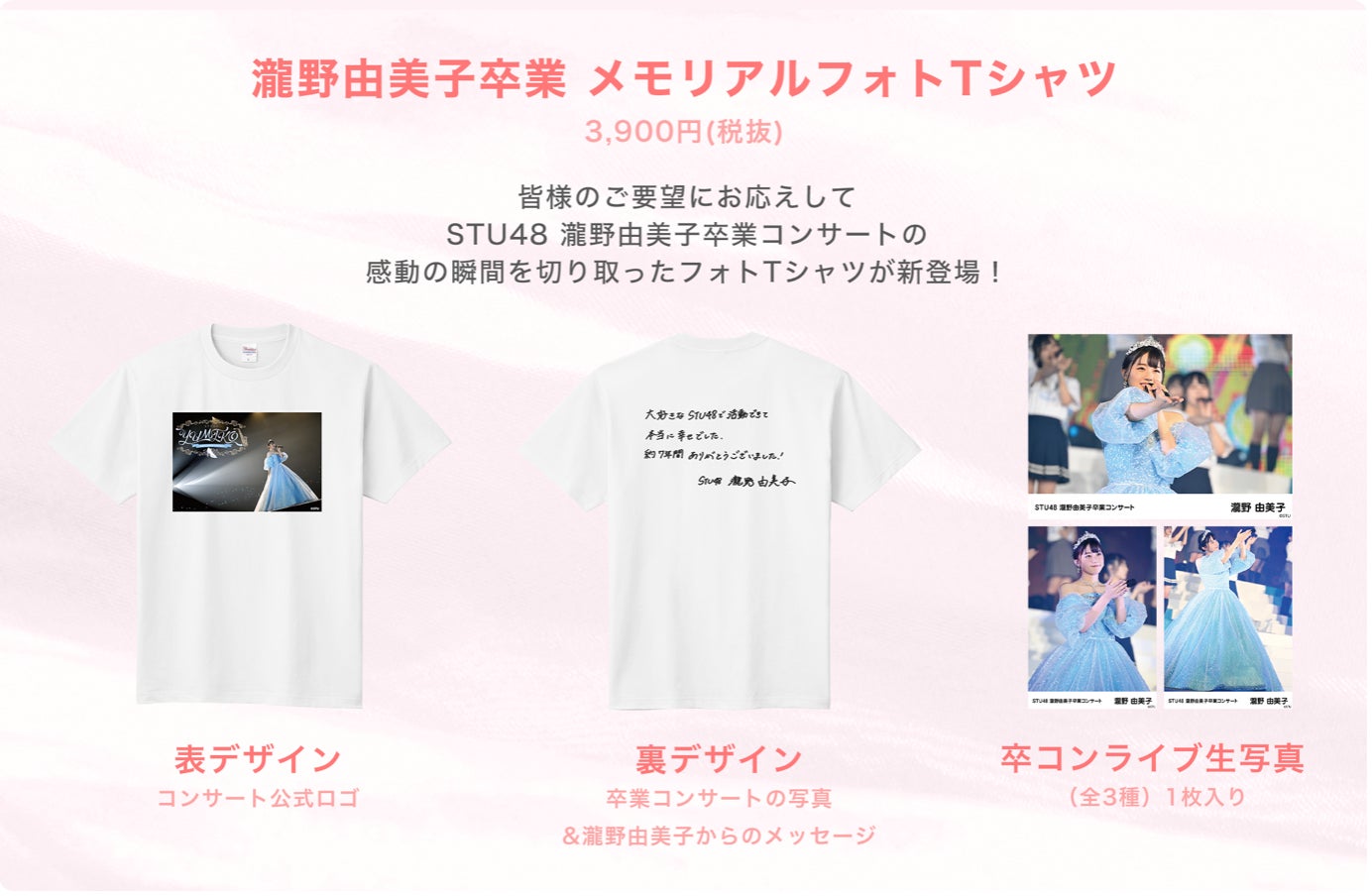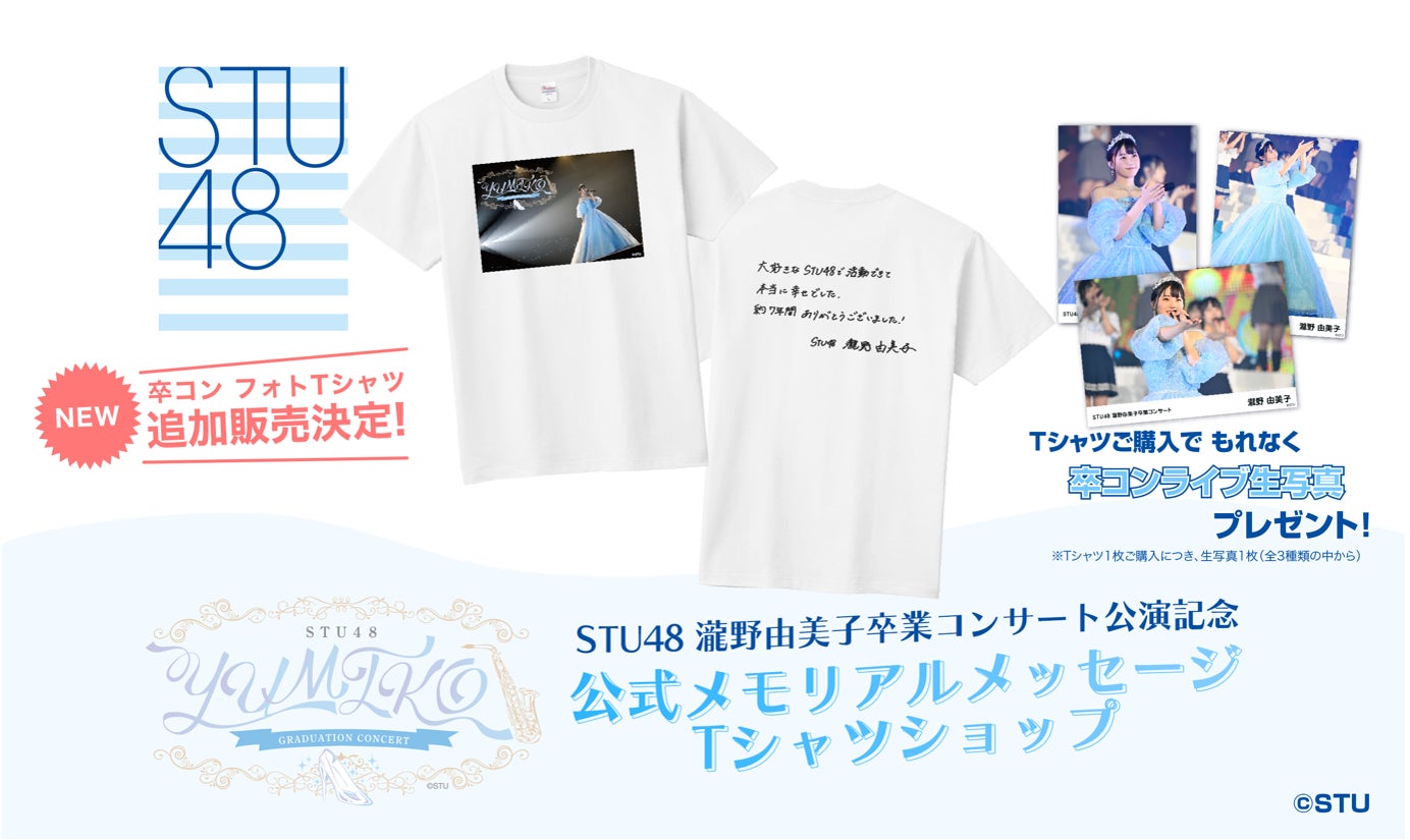2023年11月3日に行われた『STU48 瀧野由美子卒業コンサート』から、記念にぴったりなTシャツが登場します!このTシャツには、晴れやかな卒業コンサート当日の瀧野由美子の姿と、コンサート終盤にも披露された瀧野由美子自筆メッセージがデザインされています。