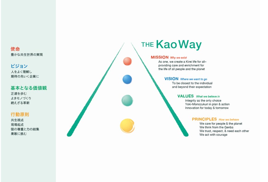 花王グループは、2019年4月にESG戦略「Kirei Lifestyle Plan」(キレイライフスタイルプラン)を策定しました。また2021年からは、「未来のいのちを守る~Sustainability as the only path」をビジョンに掲げた中期経営計画を推進しています。今後も、経営にESGの視点を導入し、高い倫理意識の堅持と実践を通じて、事業の発展と、消費者や社会へのよりよい製品・サービスの提供をめざし、パーパスである「豊かな共生世界の実現」に向けて取り組んでまいります。