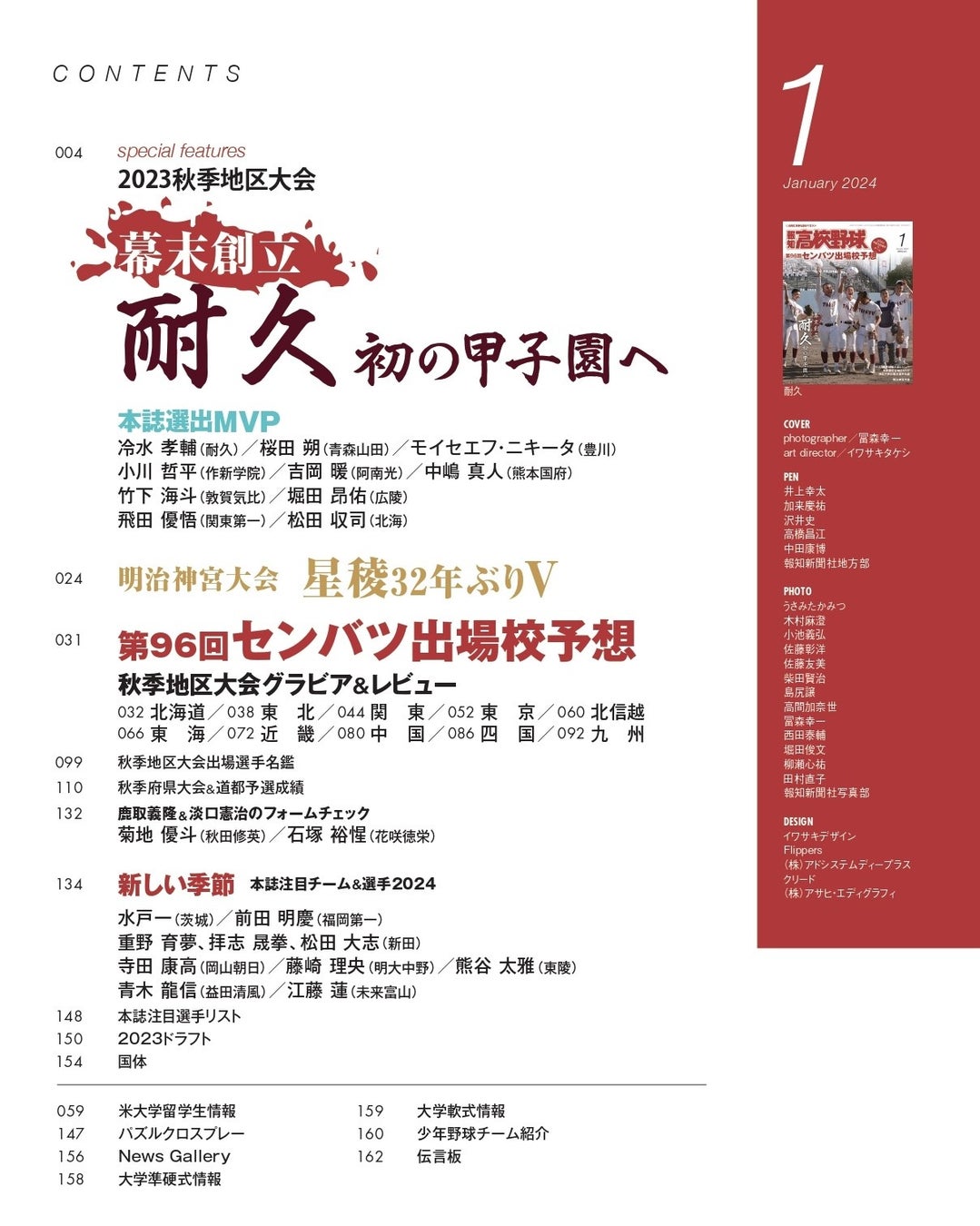 幕末の1852年(嘉永5年)創立で、秋の近畿大会4強入りし、春夏通じて初の甲子園出場を確実とした耐久(和歌山)の下克上ロマンを表紙、巻頭で特集しています。全国10地区の秋季大会を総力取材し、本誌独自に各地区MVPも選出。各地区大会の激闘を網羅したグラビア&レビューでは、今回20年ぶりに出場枠数が見直されたセンバツの一般枠、神宮大会枠を徹底分析しました。2024年本誌注目選手&チームは、52年ぶりに秋の県大会で4強入りした水戸一(茨城)をはじめ、全国の古豪や新鋭の気になる話題が満載。シーズンオフも楽しみが尽きません。
