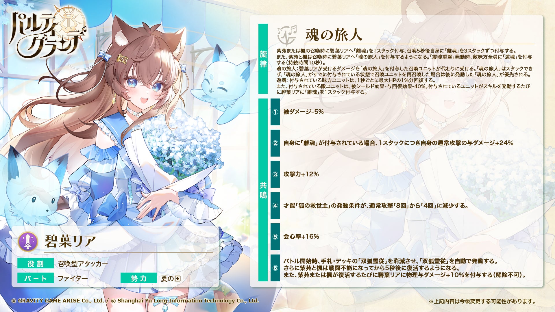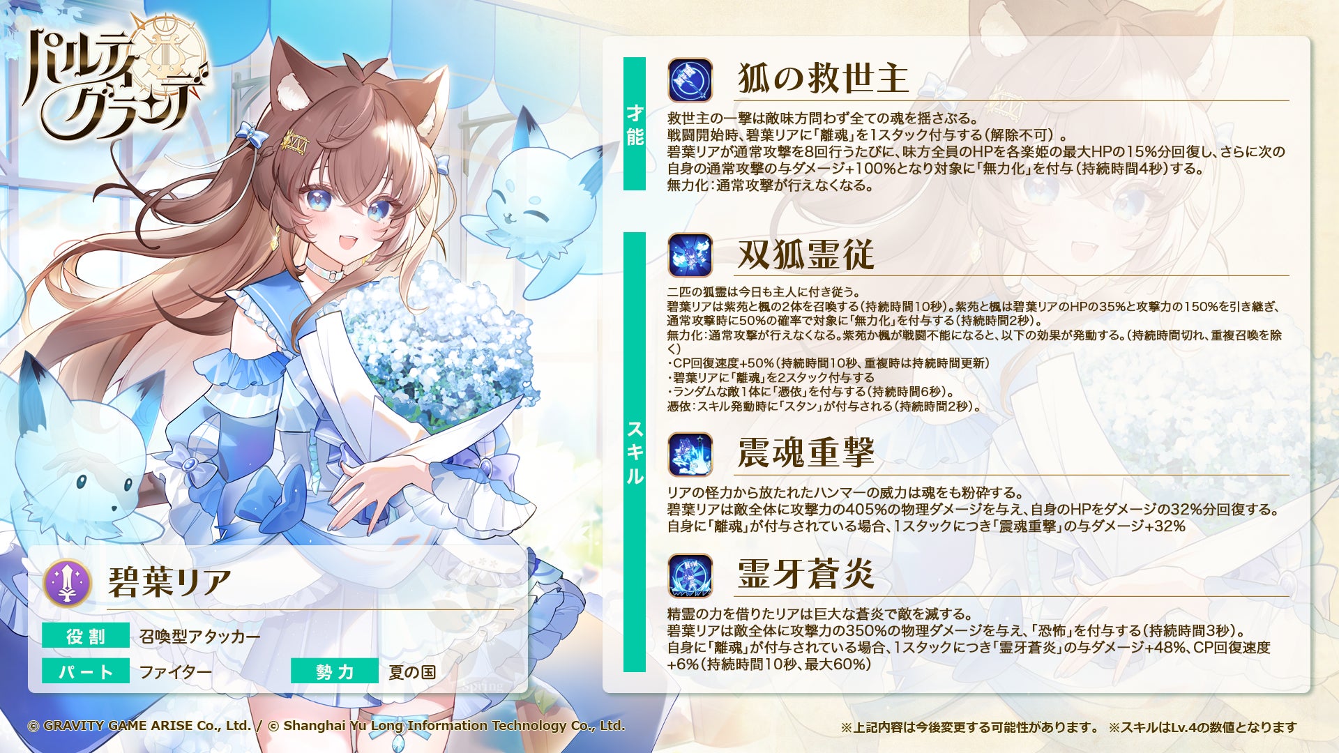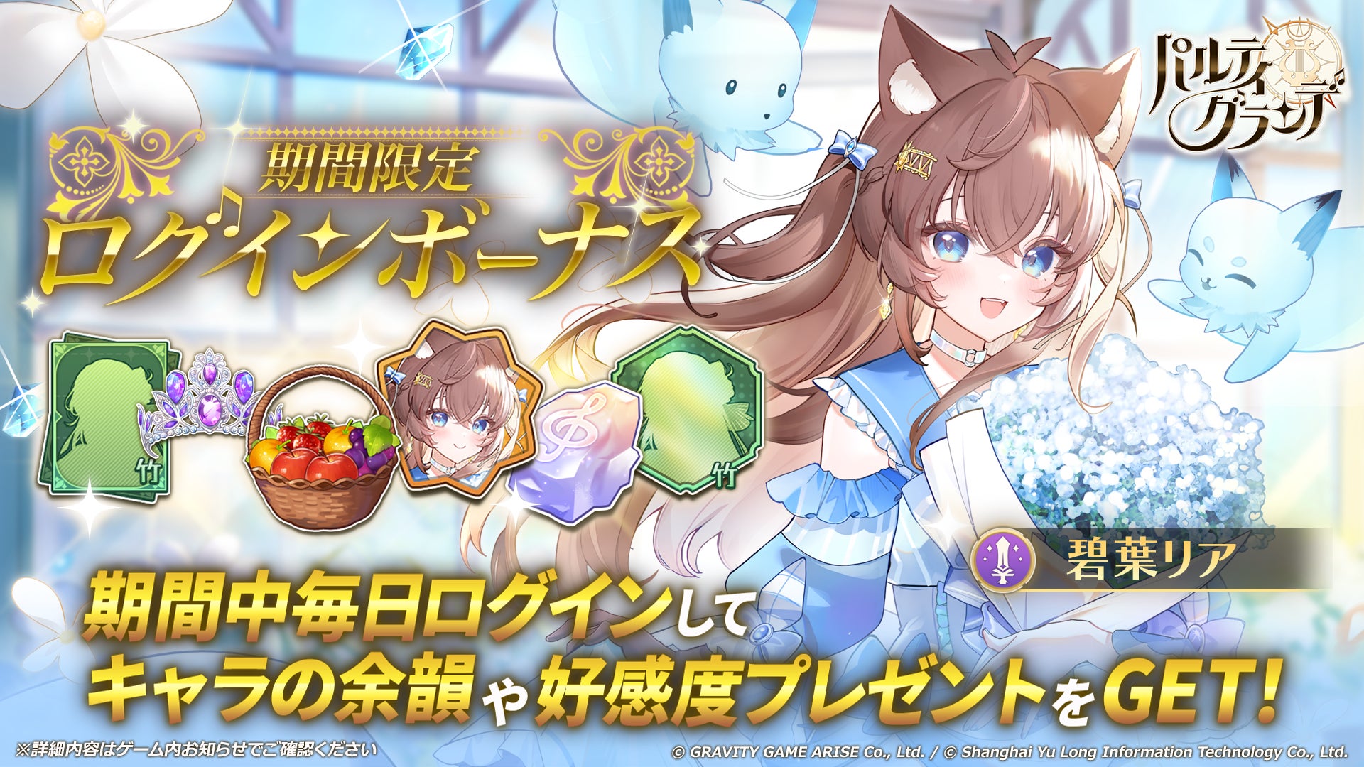 グラビティゲームアライズ株式会社(所在地:東京都中央区)は、『パルティグランデ』にて、12月31日(火)より、第4回VTuberコンテストにて特賞を獲得したVTuber 碧葉リアさんが、ゲーム内に実装されることをお知らせします。