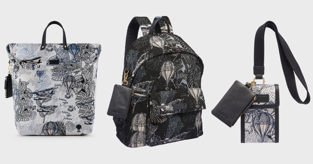 アイキャッチーなモンステラや小さなハイビスカスの花を連想させるトロピカルな植物、飛行機、気球の大胆な柄使いが、ホワイト、ライトブルー、ネイビーの海や空をイメージするブルートーンのカラーパレットで描かれたリゾートカプセルコレクション。