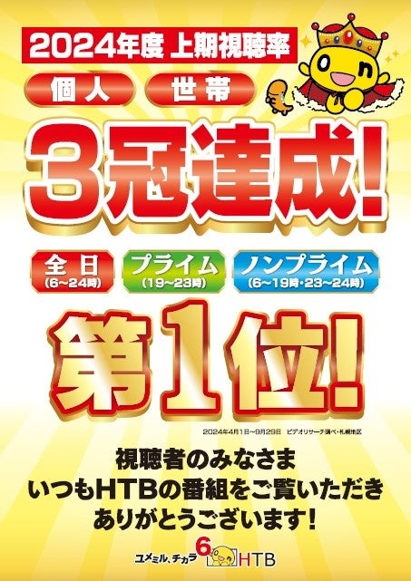 HTBは、2024年度「上期」の札幌地区視聴率において、個人全体視聴率(4才以上)と世帯視聴率の両方で、全日・プライム・ノンプライムの3部門 トップとなりました。