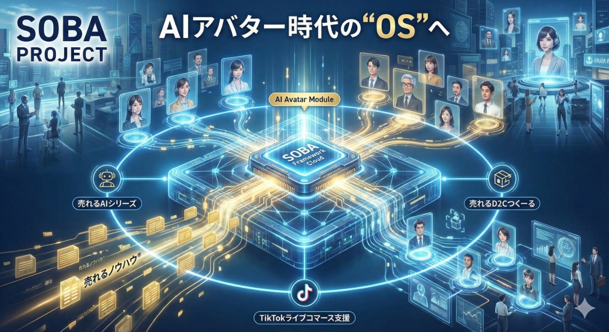 売れるネット広告社グループ株式会社(本社:福岡県福岡市、代表取締役社長 CEO:加藤公一レオ、東証グロース市場:証券コード9235、以下 売れるネット広告社グループ)の連結子会社である株式会社SOBAプロジェクトの戦略的プロジェクトである『SOBAプロジェクト』は、このたび、基幹フレームワークである『SOBAフレームワーククラウド』に、次世代の成長エンジンとなる「AIアバターモジュール」を正式に組み込みました。