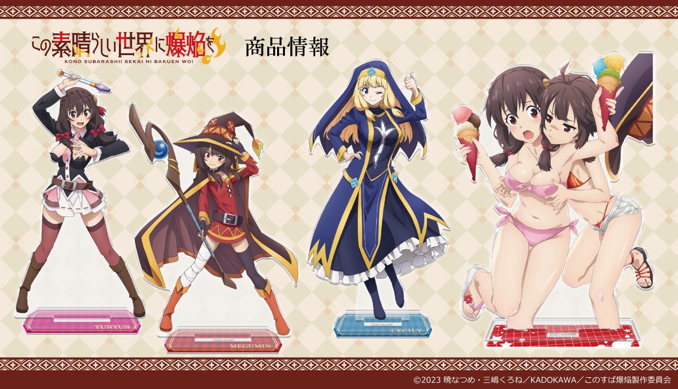【きゃらON!アニメ「この素晴らしい世界に爆焔を!」商品ページ】https://www.charaon.jp/SHOP/130420/147420/list.html