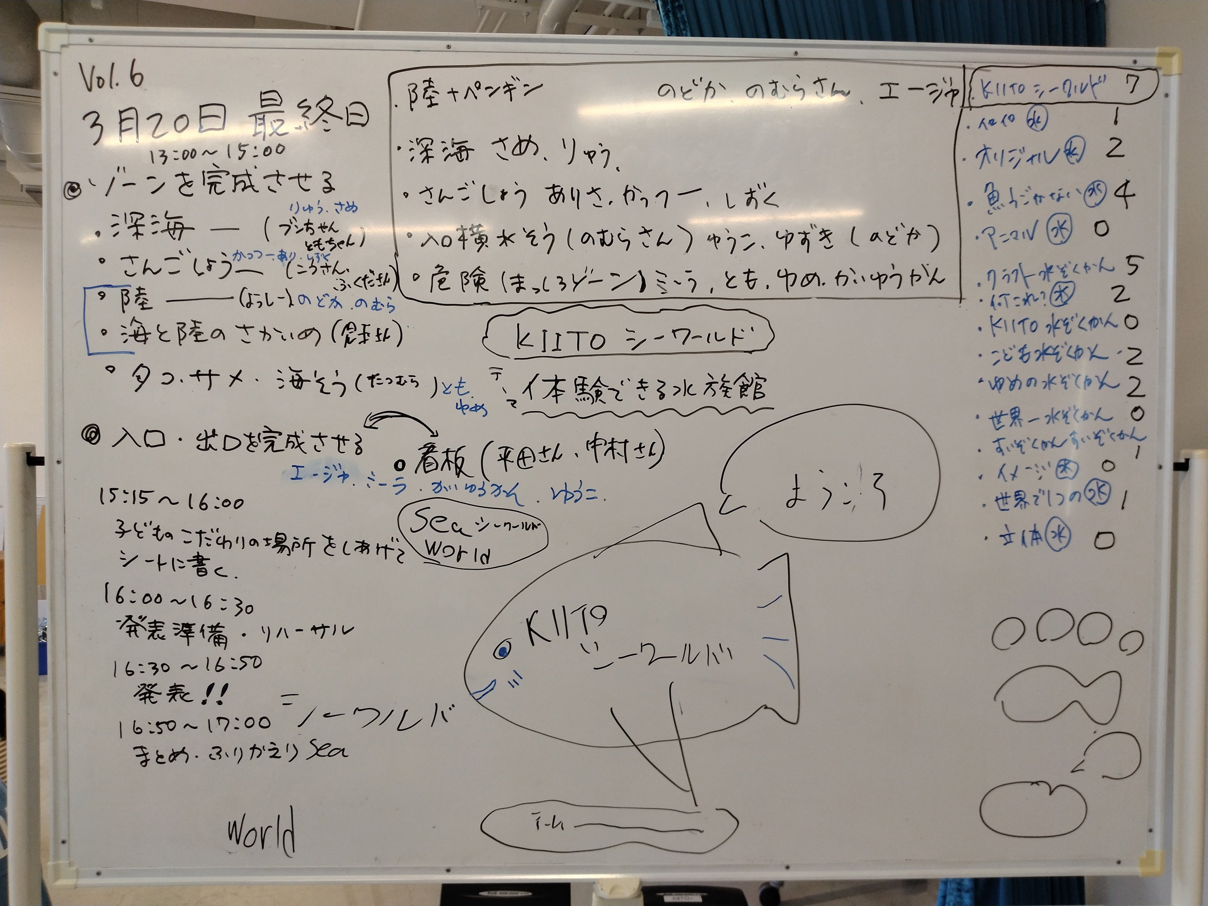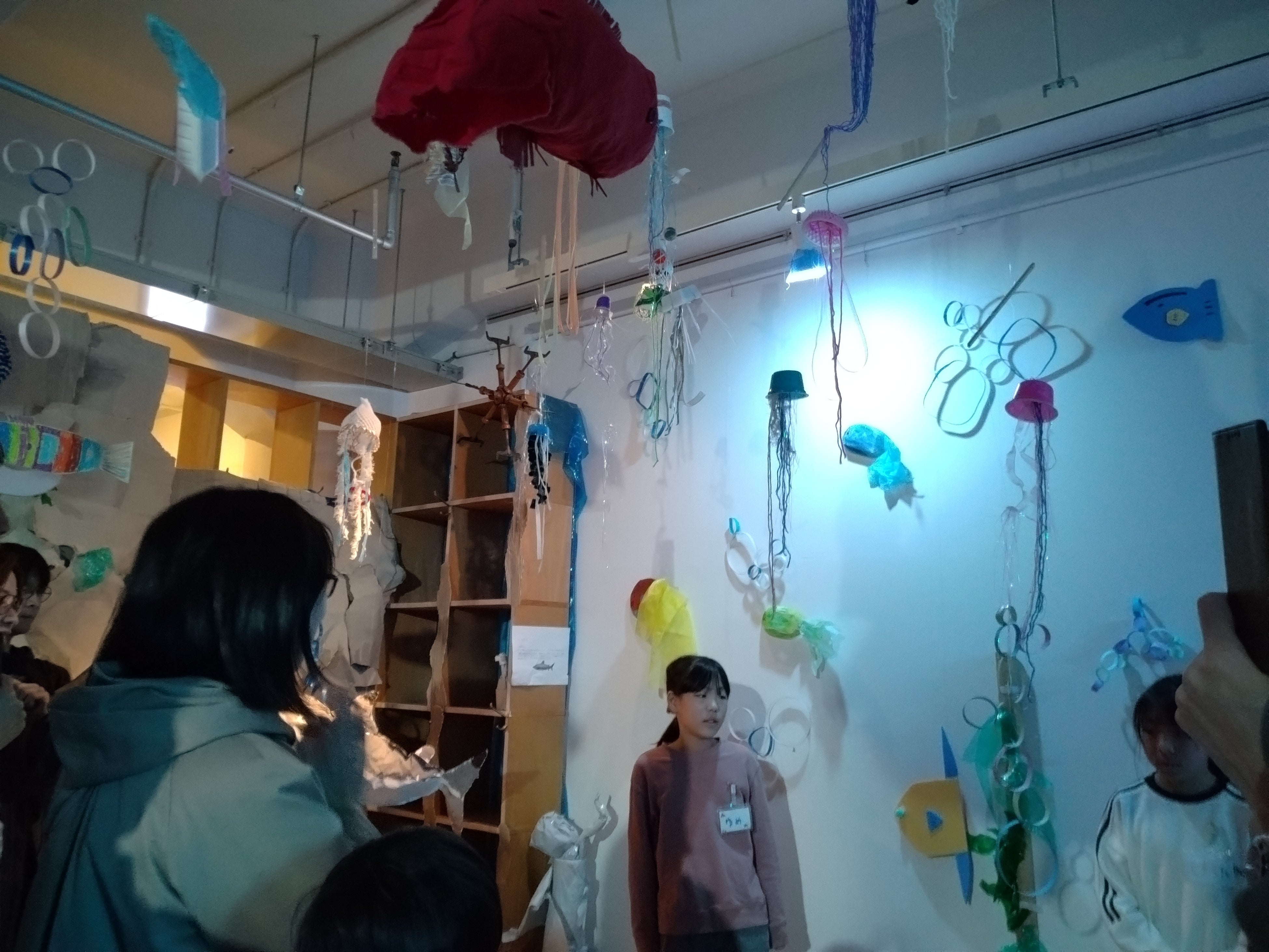 最終日となる3月20日(金・祝)には、完成した水族館の発表会を開催しました。水槽の概念がなく、空間全てが水族館。「穏やかに泳ぐジンベエザメやクロマグロ」「ふわふわ漂うクラゲ」「暗闇で光る魚のゾーン」など、大人では思いつかないような独創的なアイデアに、スタッフも驚かされるばかり。