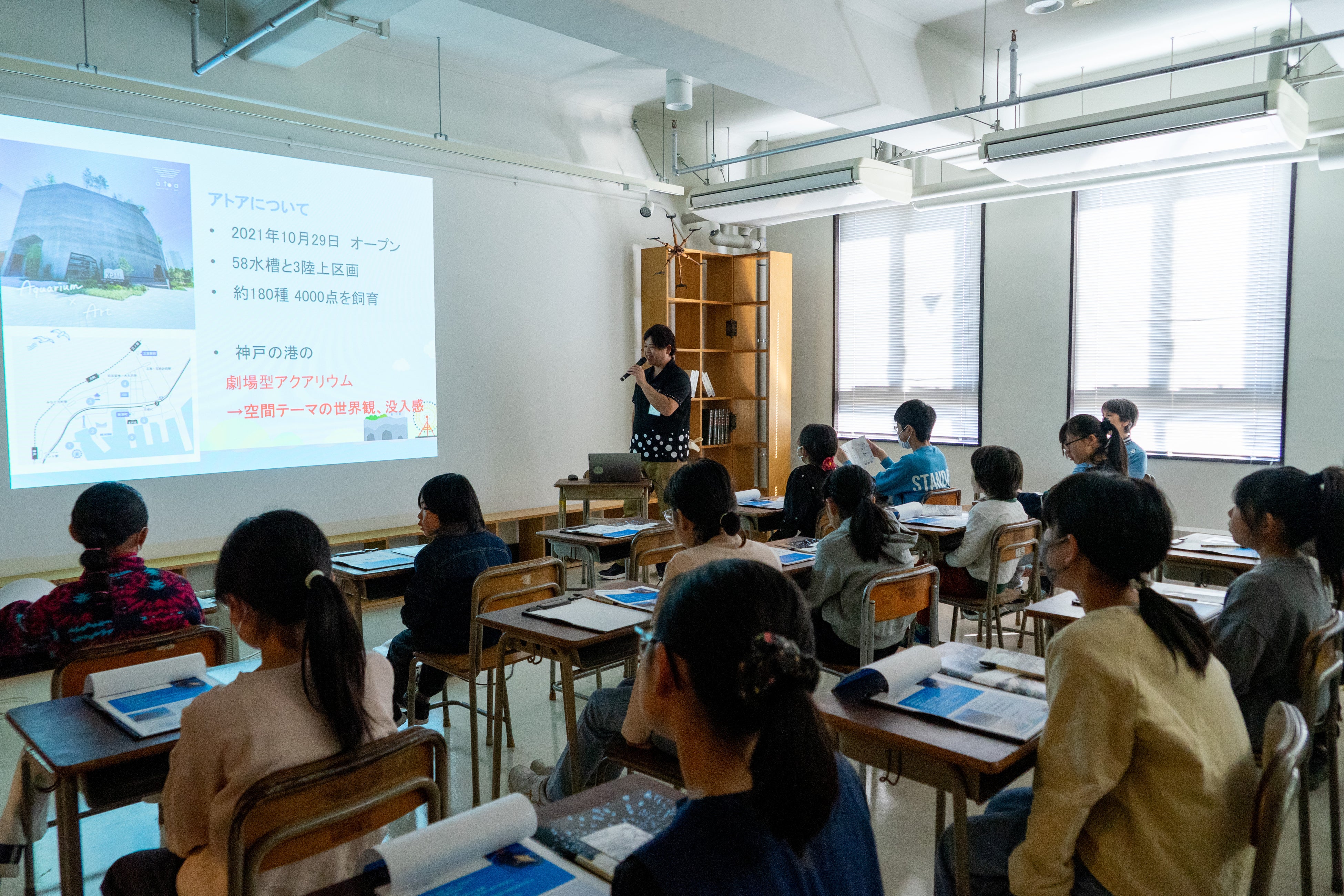 学びとコンセプト構築: 初回はKIITOで、アトアの飼育員から水族館や生きものについてレクチャー。その後、「アトア」を実際に見学し、生きものの色や形、環境を観察。「どんな水族館があったら面白いか」をみんなで語り合いました。