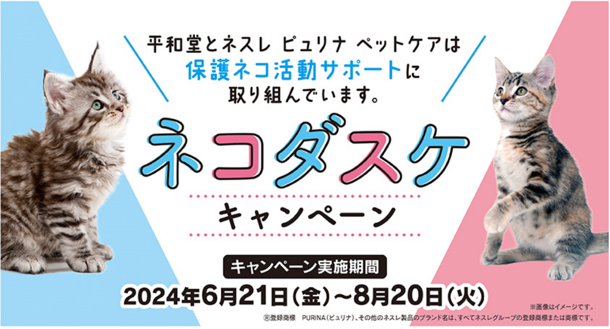平和堂とネスレ ピュリナ ペットケアは、今回で13回目となる保護ネコ活動をサポートする「ネコダスケキャンペーン」を6月21日(金)から8月20日(火)まで実施しています。