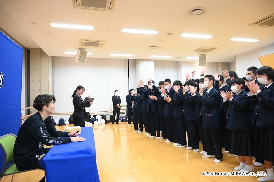 また、長野選手の退場時には生徒の皆さん全員が花道を作り、溢れる笑顔の中ハイタッチで見送っていただくなど、楽しい雰囲気で過ごしていただくことができました。