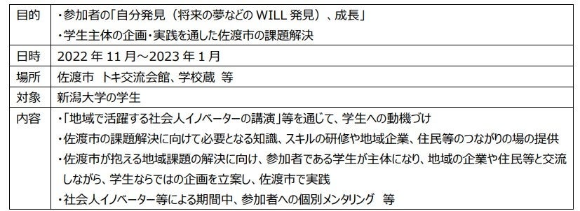 佐渡市の持続的な発展に向けた地域循環型社会の実現を目指すため、佐渡市においてワークショップ等を開催するなど、佐渡市の企業や住民、学生、社会人イノベーターが集い、交流し、学び合う佐渡市の課題解決プログラムを実施していきます。今回、本プログラムのスタートとして、新潟大学の学生を中心とした「学生エンパワーメントと佐渡市の課題解決を両立する佐渡イノベーション・プログラム(トライアル)」を実施します。
