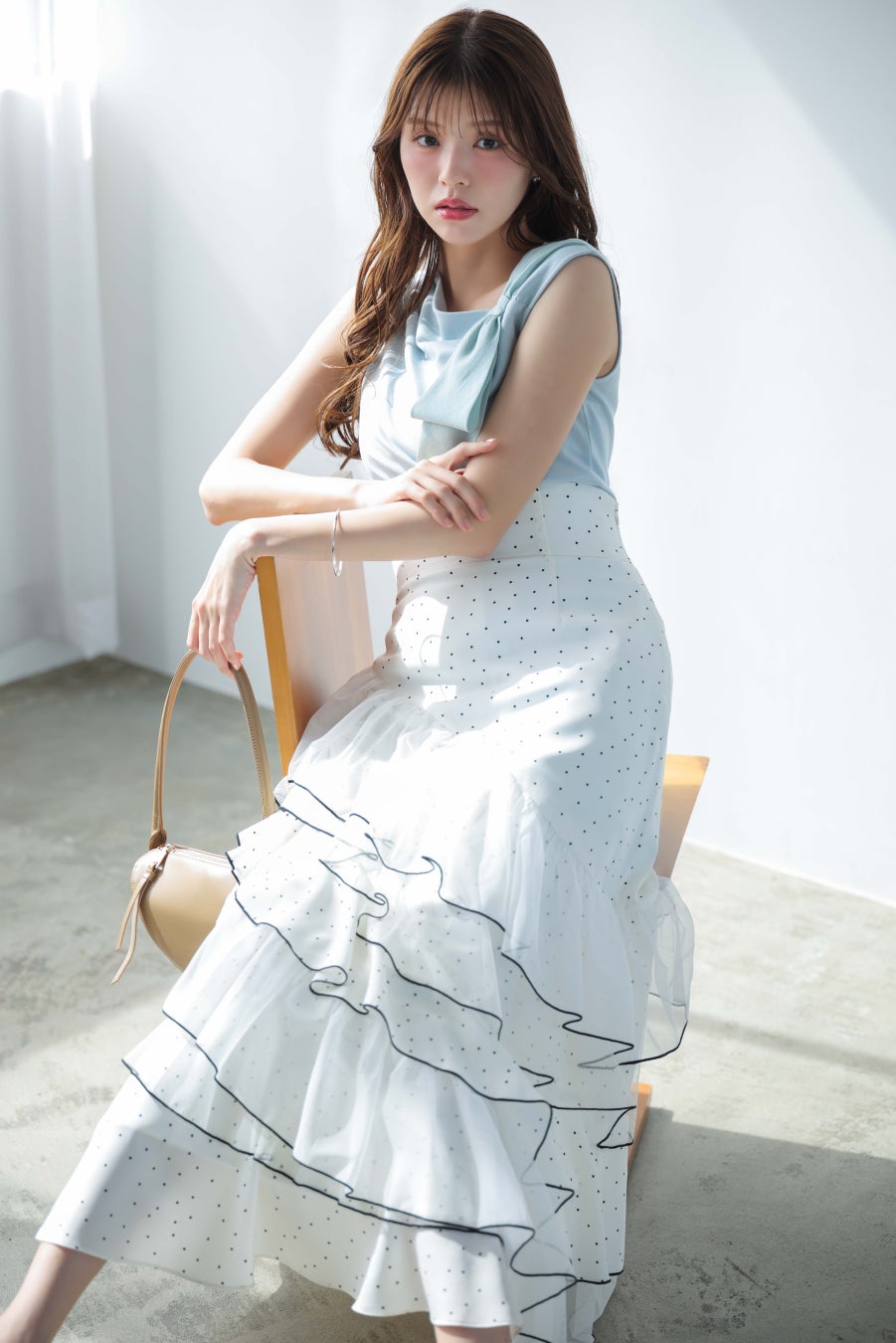 ラッフルフリルがドラマティックに揺れるドット柄スカートを合わせた、