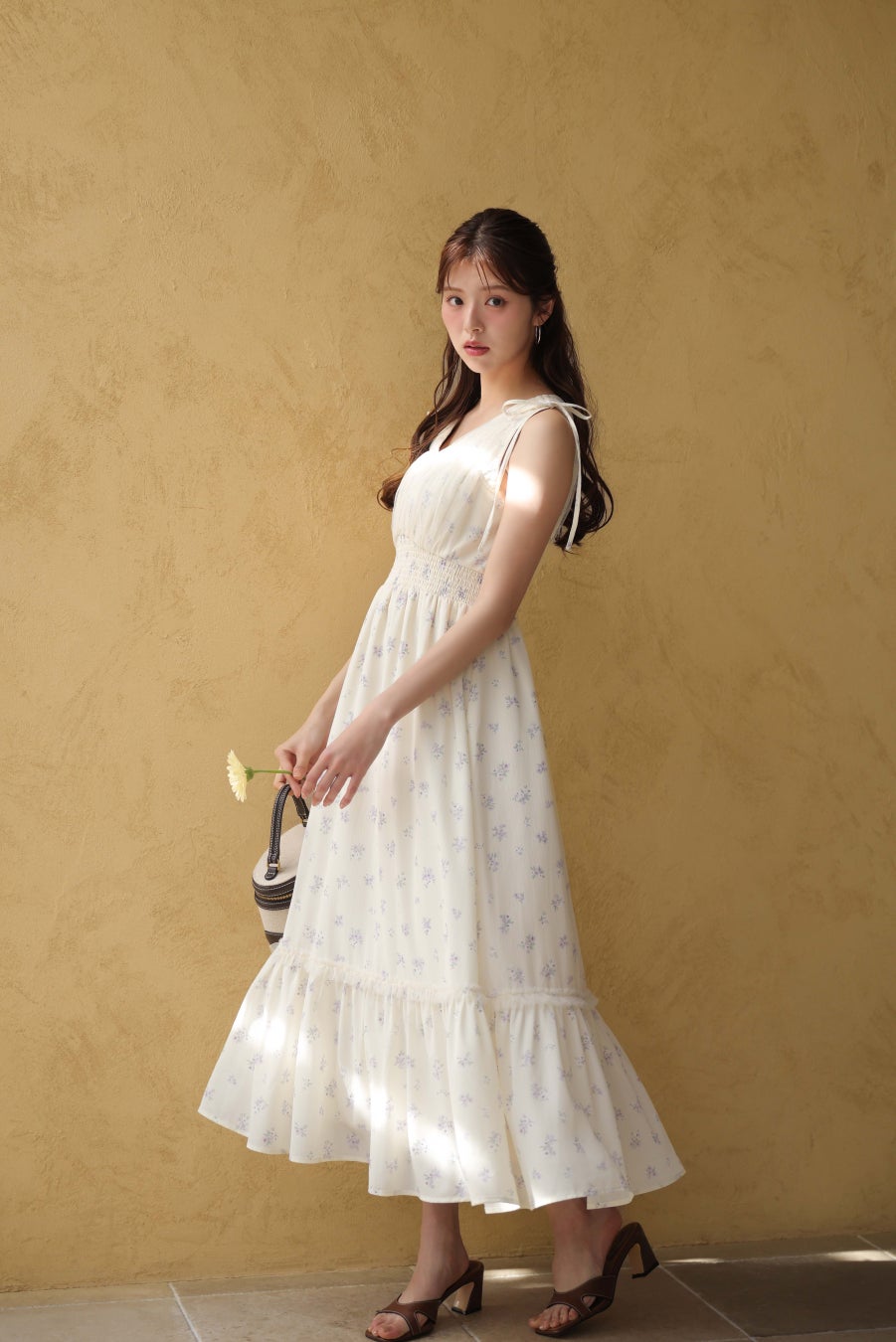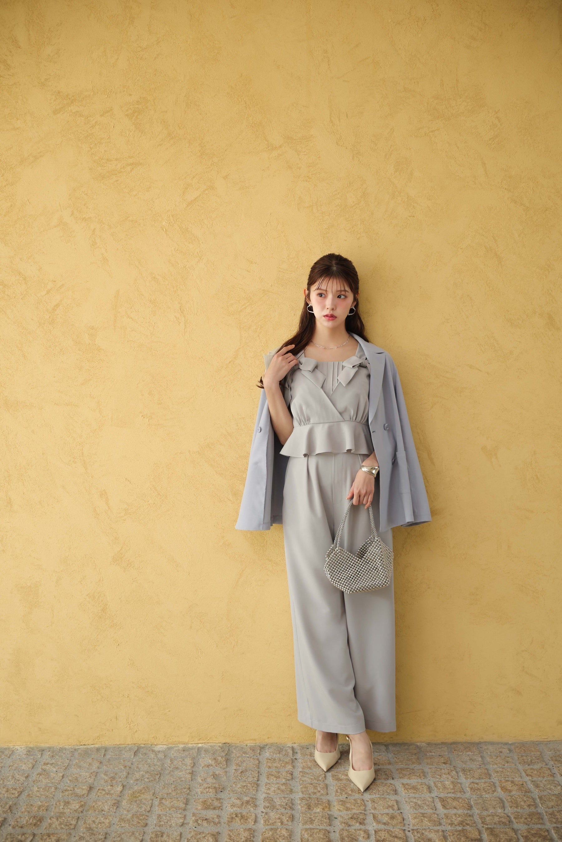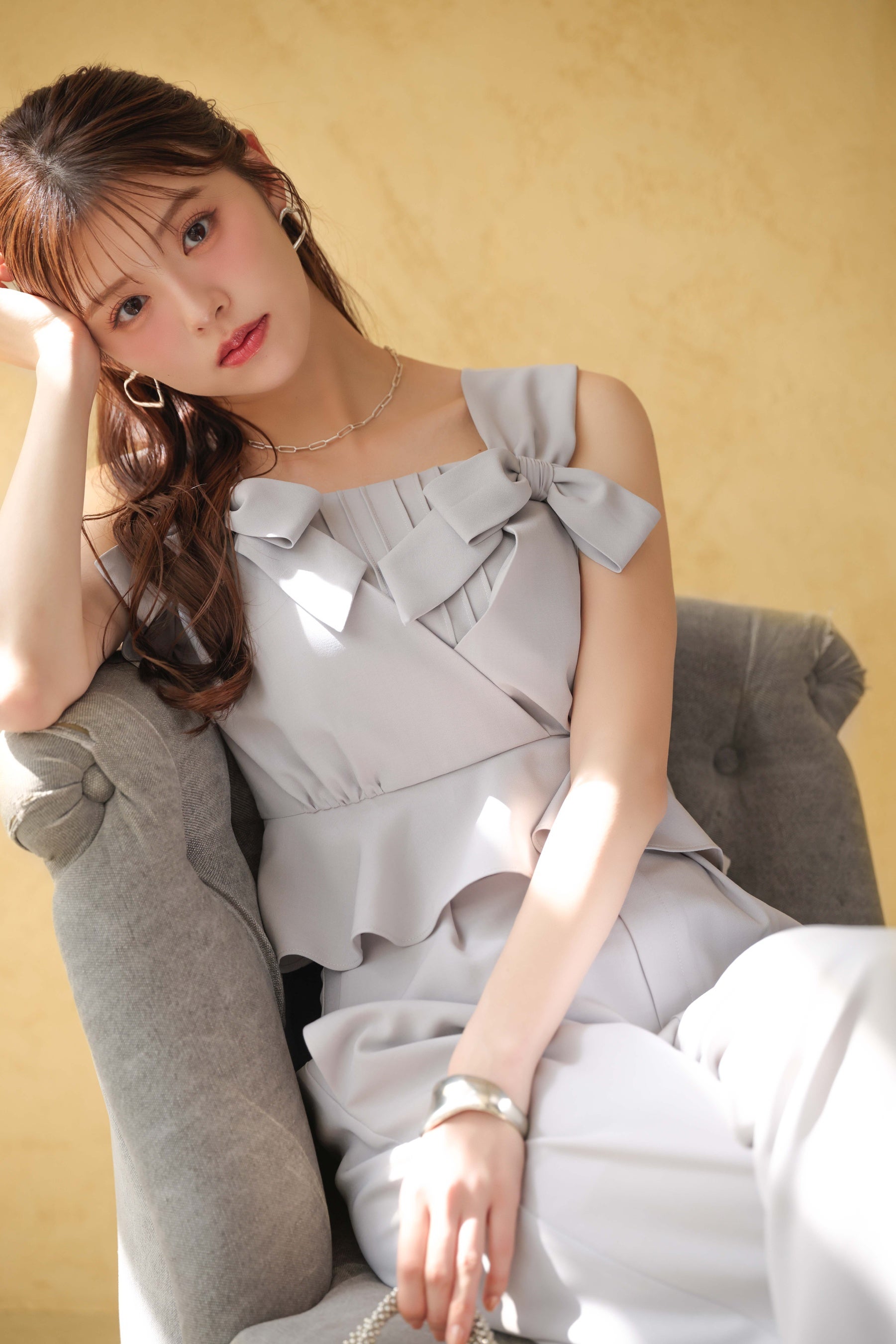 肩口の大きなリボンとふんわり広がるペプラムシルエットが目を惹く、
