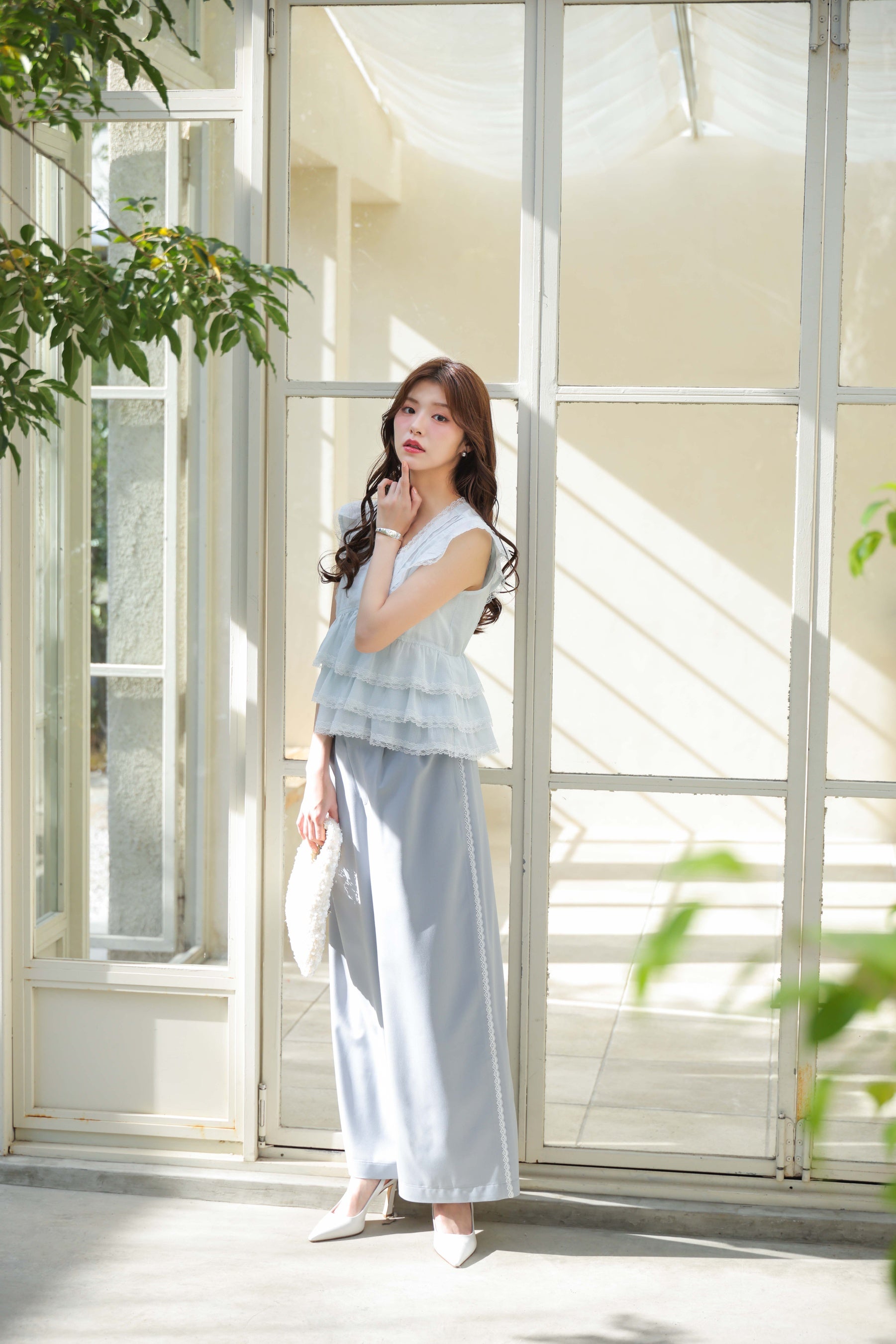 涼しげなブルーグレーを、繊細なレースで洗練。こなれ感たっぷりのフェミニンスタイル。