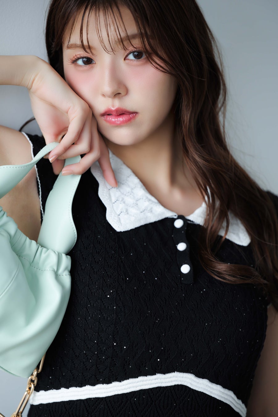 さりげなくきらめくスパンコールと白襟が目を惹く、クロシェ編みニットワンピース。