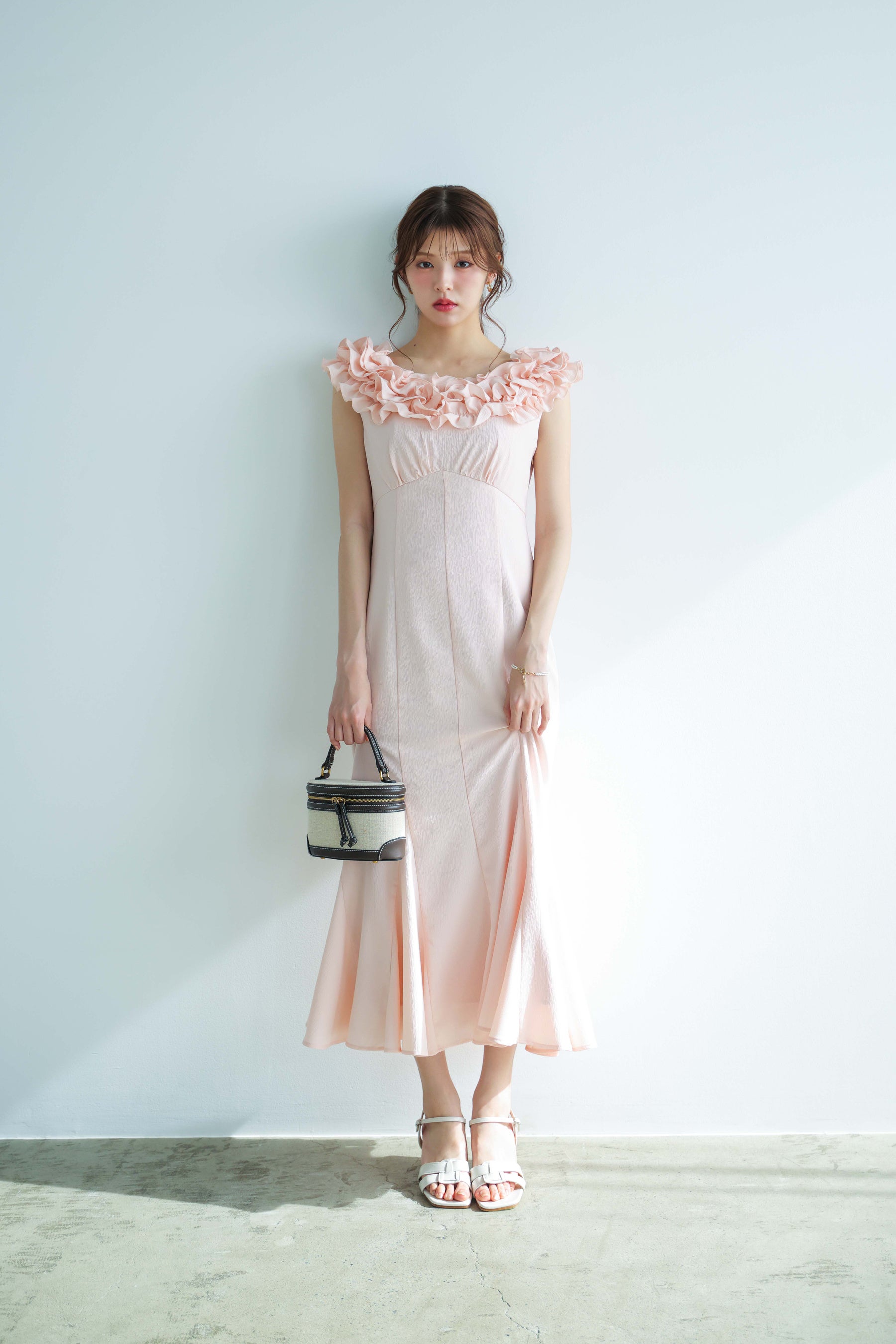 襟元のラッフルフリルが視線を惹きつける、主役級のフェミニンワンピース。