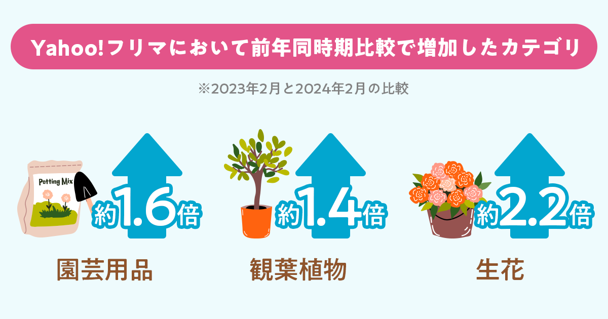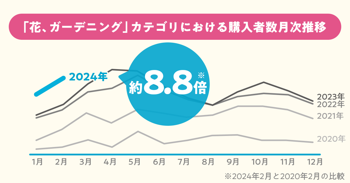 ガーデニング関連アイテムの取引も年々増加しており、2020年1月から2024年2月までの「花、ガーデニング」カテゴリの購入者数は伸び続け、2月は2020年の同時期と比べて約8.8倍とこの時期大きく増加していることがわかります。