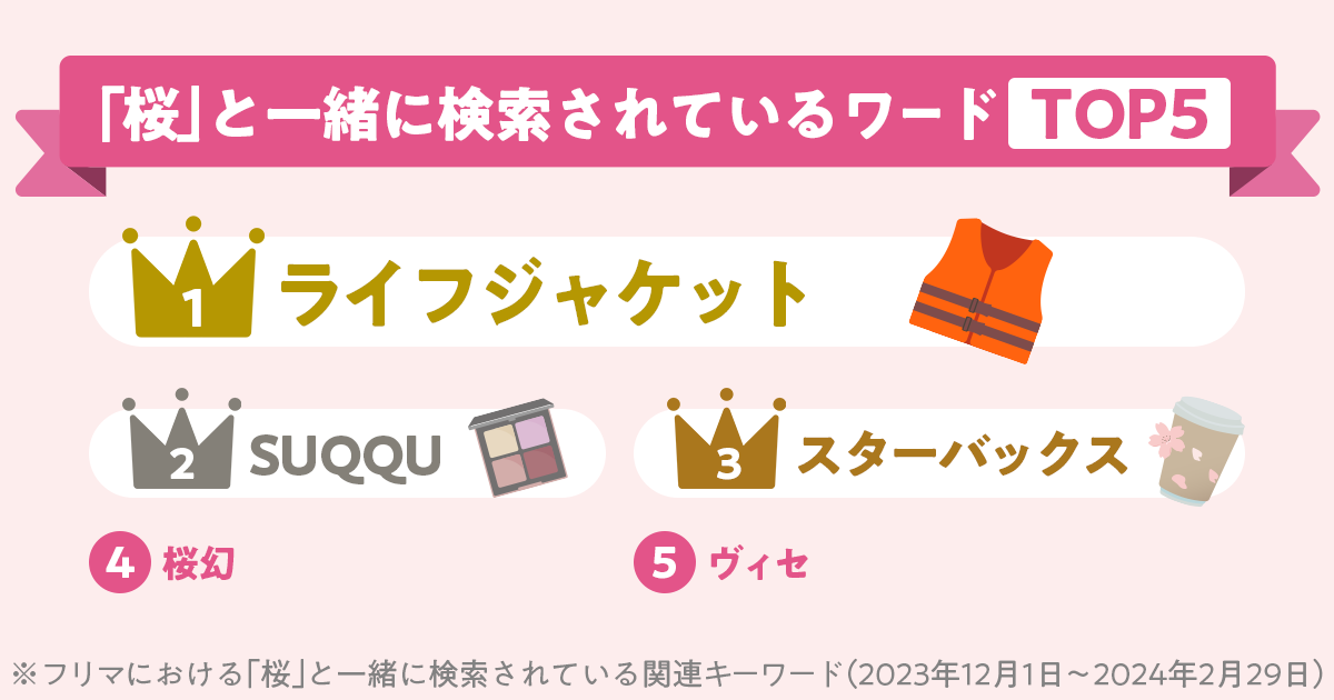 2023年12月1日から2024 年2月29日までの検索データをもとに「Yahoo!フリマ」で、「桜」と一緒に検索されたキーワードの上位5位をランキング形式で発表しました。
