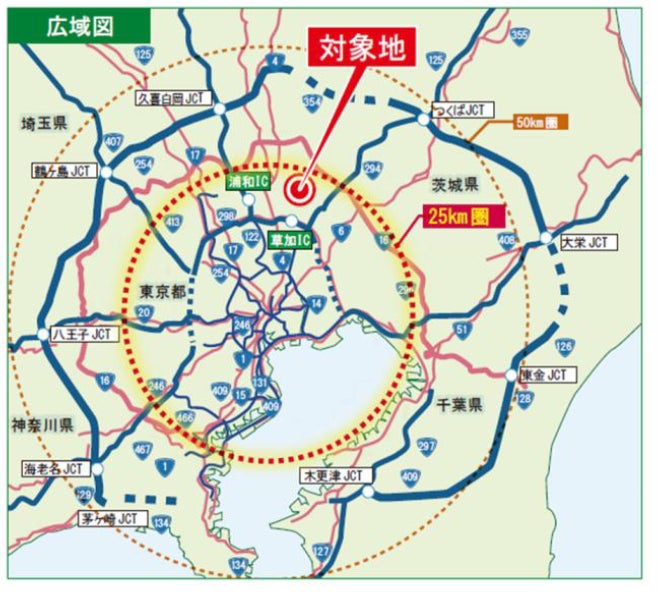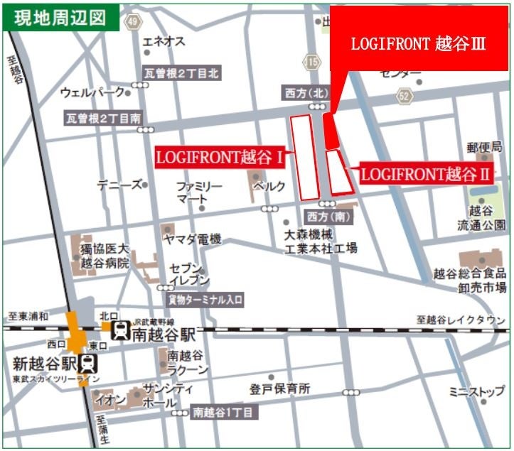 本施設は、現在稼働中の「LOGIFRONT越谷Ⅰ」「LOGIFRONT越谷Ⅱ」に併設し、国道16号線の内側、都心から25km圏内、東京外環自動車道「草加」ICから約6kmに位置しています。また、国道4号線へのアクセスも良好で道路の混雑状況に応じた配送ルートの選択が可能な物流拠点として、最適な立地に位置しています。さらに、周辺に住宅エリアが広がり雇用確保の面においても良好な環境です。