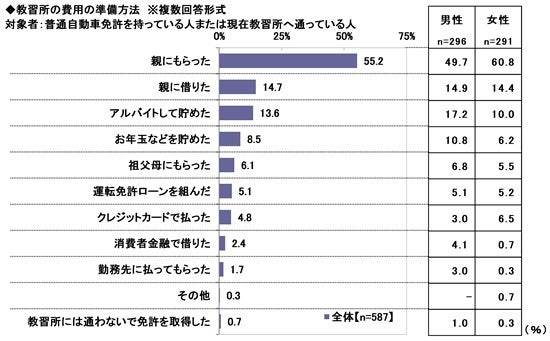普通自動車免許を持っている方または現在教習所へ通っている方587名に、教習所の費用をどのようにして準備したかを聞いたところ、「親にもらった」(55.2%)が最も多く、次いで、「親に借りた」(14.7%)、「アルバイトして貯めた」(13.6%)、「お年玉などを貯めた」(8.5%)、「祖父母にもらった」(6.1%)となりました。