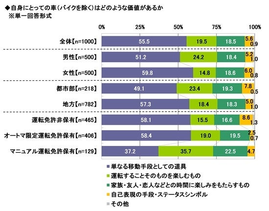 全回答者1,000名に、自身にとっての車はどのような価値があるかを聞いたところ、「単なる移動手段としての道具」(55.5%)が最も多く、次いで、「運転することそのものを楽しむもの」(19.5%)、「家族・友人・恋人などとの時間に楽しみをもたらすもの」(18.5%)、「自己表現の手段・ステータスシンボル」(5.6%)となりました。